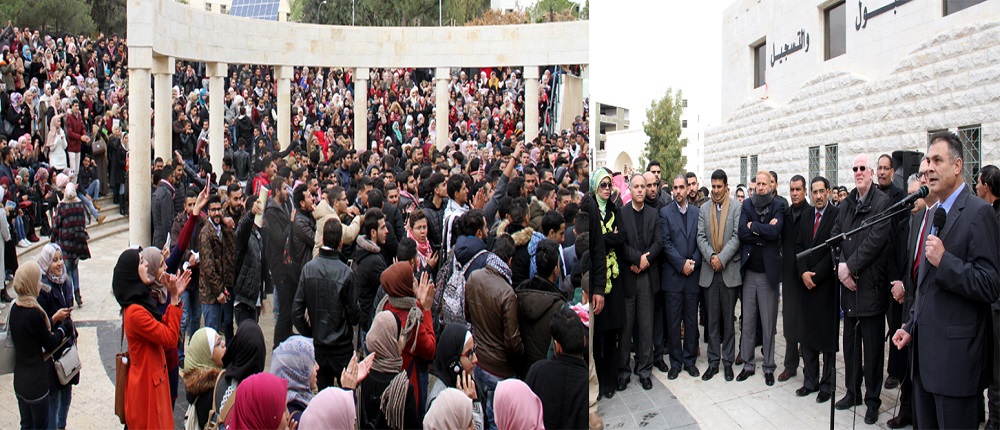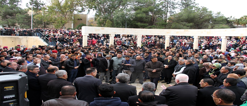 وقال رئيس جامعة البلقاء التطبيقية الأستاذ الدكتور عبدالله سرور الزعبي ان أسرة الجامعة من طلبة وأعضاء هيئة تدريس وإداريين يقفون صفا واحدا كما هو حال الأسرة الأردنية خلف جلالة الملك عبدالله الثاني المعظم في مواقفه الحازمة لحماية القدس وحقوق الشعب الفلسطيني داعيا أسرة الجامعة إلى تعميق روح الانتماء والولاء للوطن وقيادته الهاشمية ليبقى الاردن قويا منيعا ورديفا للأشقاء الفلسطينيين وحماية الأماكن المقدسة؛ فالقدس رمز السلام وعنوانه وعلى أرضها وأسوارها استبسل الجيش العربي المصطفوي وقدم الشهداء والدماء الزكية ، وفيها استشهد المغفور له بإذن الله جلالة الملك المؤسس عبدالله الأول ، ويحتضن ثراها المغفور له الشريف الحسين بن علي ، والرعاية الهاشمية للاماكن المقدسة مستمرة منذ عام 1924 ، وختم الدكتور الزعبي بأن القدس سيتم تدريسها لطلبة الجامعة ضمن مادة التربية الوطنية في الجامعة.