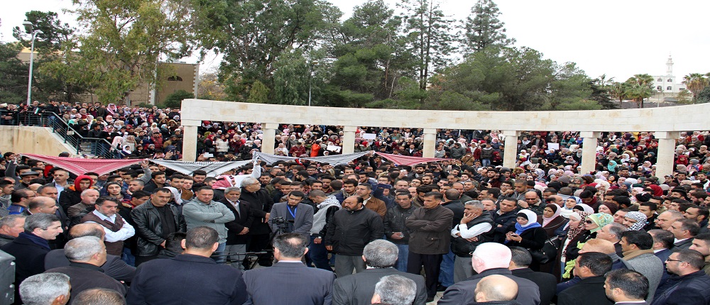 أقامت كليات جامعة البلقاء التطبيقية في مركز الجامعة في السلط وفي جميع الكليات التابعة لها على ارض الوطن وقفات تضامنية مع القدس في يوم غضب يعم جميع أنحاء الوطن احتجاجا واستنكارا على قرار الرئيس الأمريكي ترامب بنقل السفارة الأمريكية إلى القدس والاعتراف بها عاصمة لإسرائيل وبين المتحدثون بان هذا القرار الأمريكي مخالف لكل القوانين والقرارات الدولية ويشكل حجر عثرة أمام تحقيق السلام العادل وإقامة الدولة الفلسطينية وعاصمتها القدس الشريف.