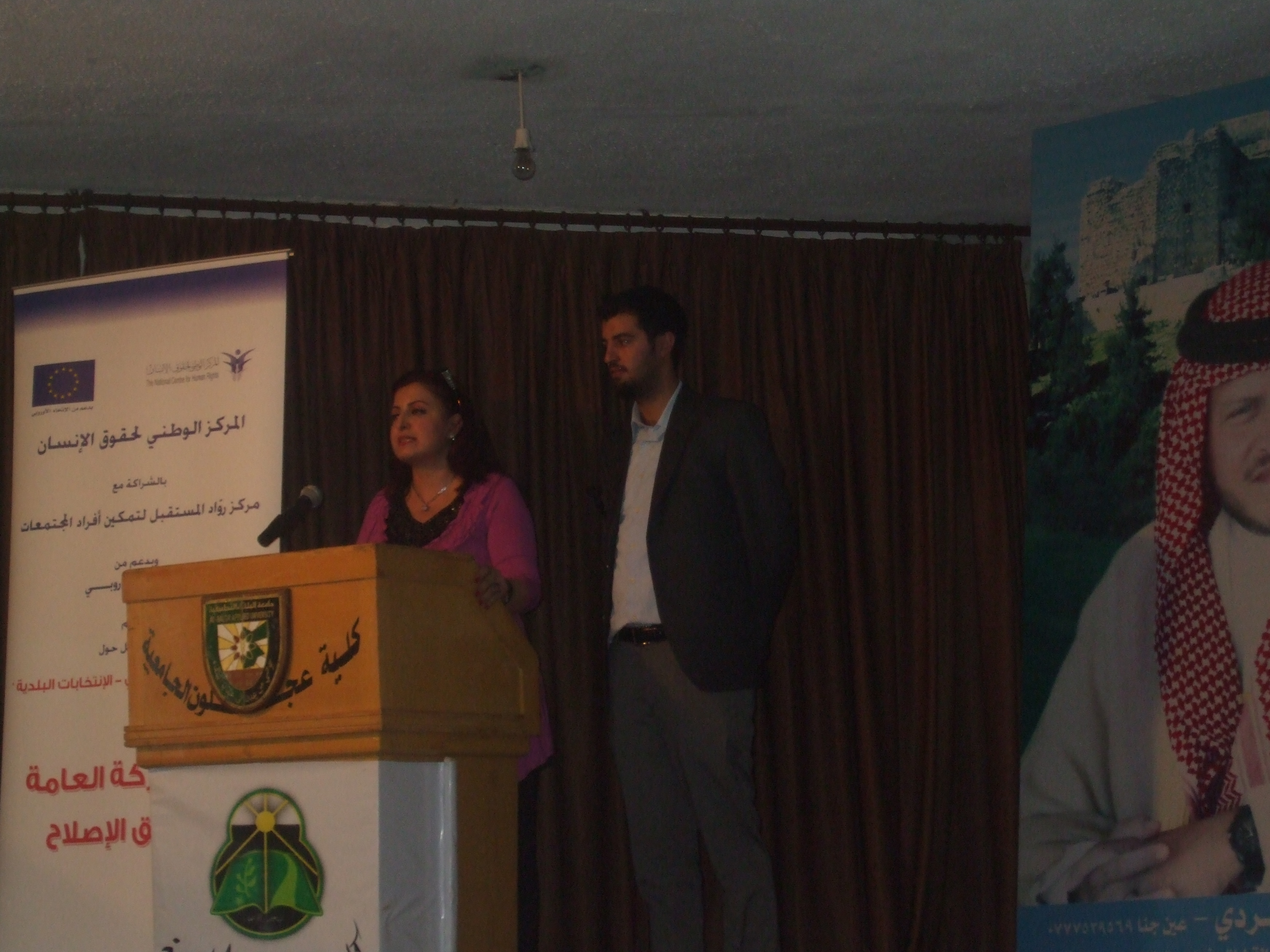 وقالت مديرة المشاريع في المركز مرام الربضي ان العرض المسرحي التفاعلي الذي قدمته فرقة الفن من اجل حقوق الإنسان من منظمة العفو الدولية هدف الى التأكيد على اهمية مشاركة فئة الشباب وخاصة طلبة الجامعات في الانتخابات البلدية القادمة والتي ستعقد في السابع والعشرين من آب.
