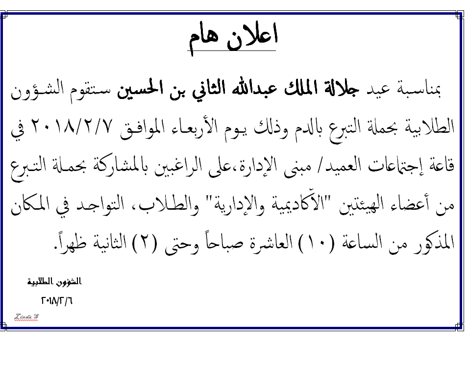 اعلان صادر عن الشؤون الطلابية/حملة تبرع بالدم