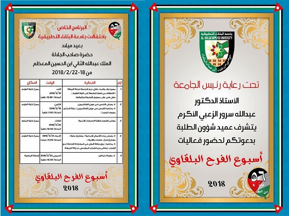 البلقاوي والذي سينطلق يوم الاحد 2018/2/18 ويستمر حتى نهاية الاسبوع ويتضمن العديد من الفعاليات والنشاطات ويقام في مركز الجامعة /السلط .