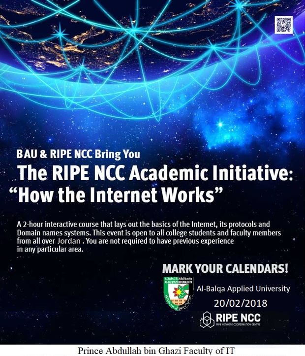 دعوة عامة لطلبة تكنولوجيا المعلومات وهندسة الحاسوب في جامعة البلقاء التطبيقية لحضور فعالية بعنوان The RIPE NCC Academic Initiative:“How the Internet works”