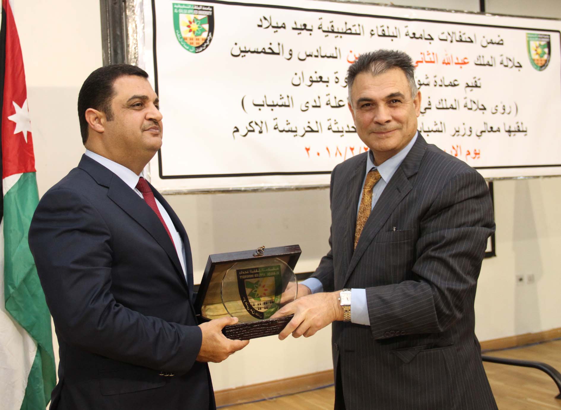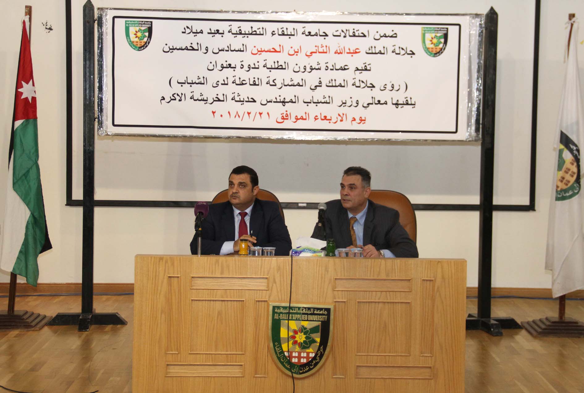 وبين الخريشا خلال المحاضرة التي نظمتها عمادة شؤون الطلبة في الجامعة بحضور الاستاذ الدكتور عبدالله سرور الزعبي رئيس الجامعة بعنوان (رؤى جلالة الملك في المشاركة الفاعلة لدى الشباب) ضمن احتفالات الجامعة بعيد ميلاد جلالة الملك المعظم السادس والخمسين الى ان الشباب لابد ان يكون لهم دور كبير ومحوري في بناء الوطن مشيرا ان الى معظم قادة المجتمع ومن بينهم رؤساء البلديات هم في اغلبيتهم من فئة الشباب واضاف الخريشا ان جلالة الملك المعظم ومنذا توليه عرش المملكة الاردنية الهاشمية وجه الى ضرورة اعطاء الشباب دورهم في بناء الدولة الاردنية الحديثة وانعكس ذلك في التشريعات والقوانين ومنها قانون اللامركزية والبلديات والذي اتاح للشباب المشاركة الفاعلة في الانتخابات واعطائهم حق الترشح في عمر الخامسة والعشرين وتطرق الخريشا الى ضرورة ايلاء الشباب دورهم في الجوانب السياسية والخدمية والاقتصادية مؤكدا على ضرورة تمكين الشباب في الجانب الاقتصادي باعتباره جانبا حيويا هاما وكان الاستاذ الدكتور عبدالله سرور الزعبي رئيس الجامعة قد اكد على اننا في جامعة البلقاء التطبيقية نعمل بكل طاقاتنا لتنفيد الاستراتيجية الوطنية لتمنية الموارد البشرية من اجل النهوض بالشباب ليكونوا فرسانا وبناة للمستقبل بعد تخرجهم مشيرا الى ابدعات الطلبة التي تتجلى في العديد من المبادارت منها مبادرة ( فينا الخير ) ومبادرة (طلبة البلقاء في مؤازرة القدس) وغيرها من المبادرات الطلابية الهامة التي تحتضنها جامعة البلقاء التطبيقية واشار الزعبي ان الجامعة خصصت في موازنتها للعام 2018 مبلغ (100الف دينار ) لدعم الافكارالابتكارية والريادية والابداعية لدى الشباب حاثا اياهم الى عدم التردد في تقديم ابتكاراتهم وابداعاتهم من خلال مراجعة عمادة شؤون الطلبة في الجامعة لافتا الى انشاء مركز للابتكار في الجامعة والذي يحتوي على دائرة للتسويق والترويج للمشاريع الابتكارية للطلبة في القطاع الخاص .