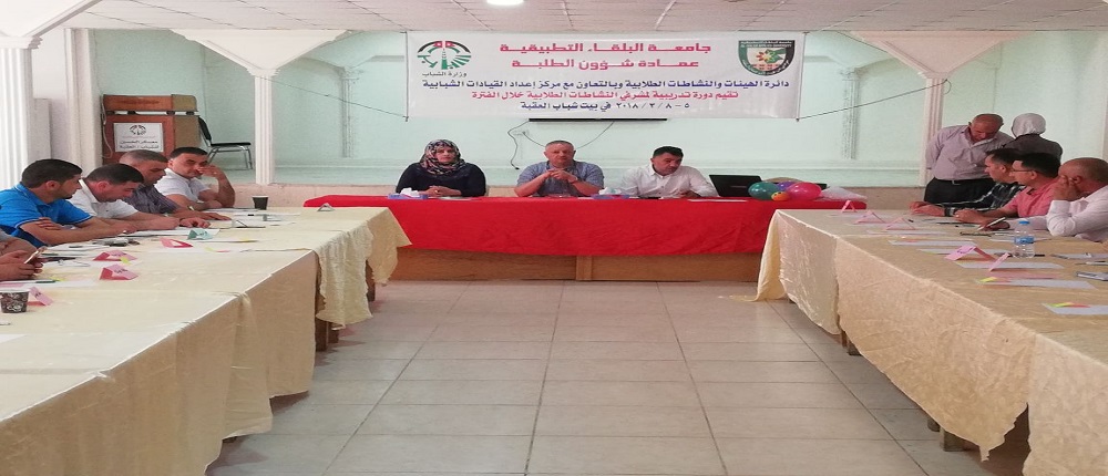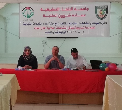 نظمت عمادة شؤون الطلبة في جامعة البلقاء التطبيقية وبالتعاون مع وزارة الشباب مركز اعداد القيادات الشبابية ورشة تدريبية لمشرفي النشاطات الطلابية في جميع كليات الجامعة بهدف تعزيز مهارات العاملين مع الشباب لإكسابهم المهارات الضرورية لإدارة البرنامج والأنشطة الخاصة بالشباب .