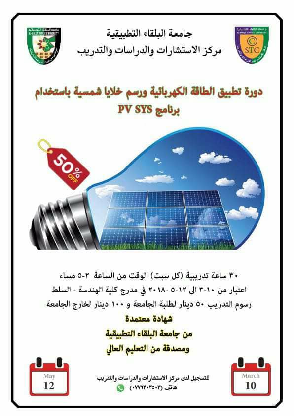 يعلن مركز الاستشارات والدراسات والتدريب عن عقد دورة تطبيق الطاقة الكهربائية ورسم خلايا شمسية باستخدام برنامج PV sys