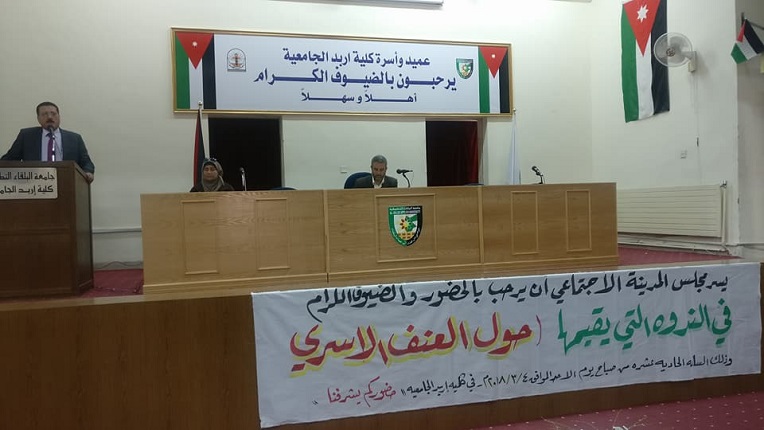 نظمت كلية اربد الجامعية وبالتعاون مع مجلس امن المدينة الاجتماعي ومركز حماية الاسرة – مديرية الامن العام , ندوة حول العنف الاسري بحضور عميد الكلية الدكتور مفضي المومني وأعضاء الهيئتين التدريسية والإدارية والطلبة وعدد من المجتمع المحلي .