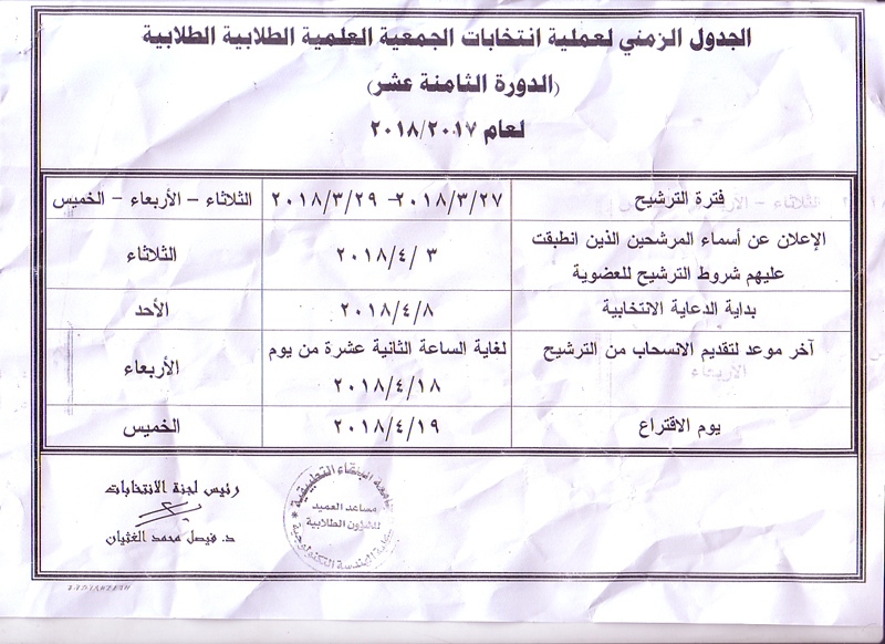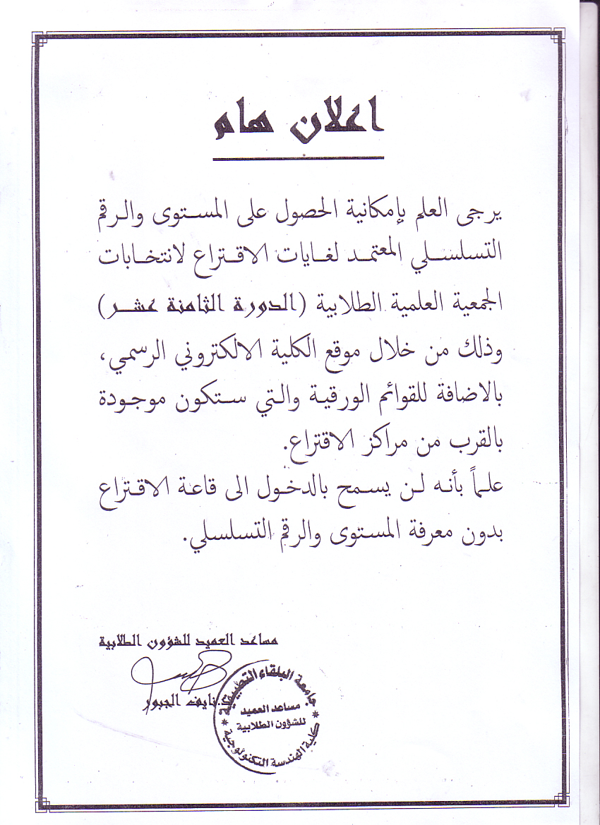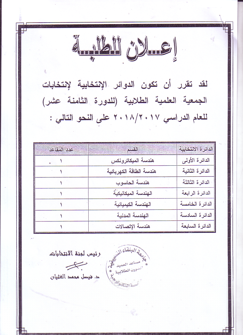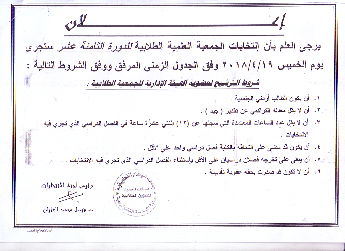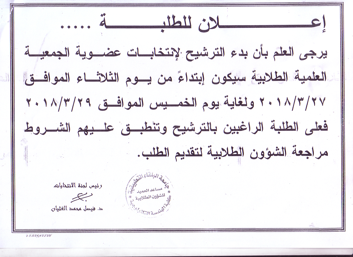 الاعلانات الخاصة بانتخابات الجمعية العلمية الطلابية الدورة الثامنة عشر