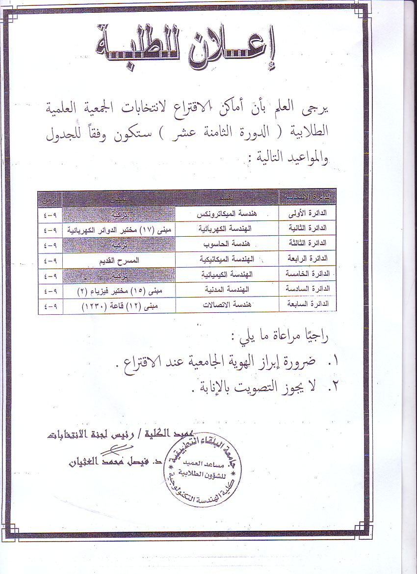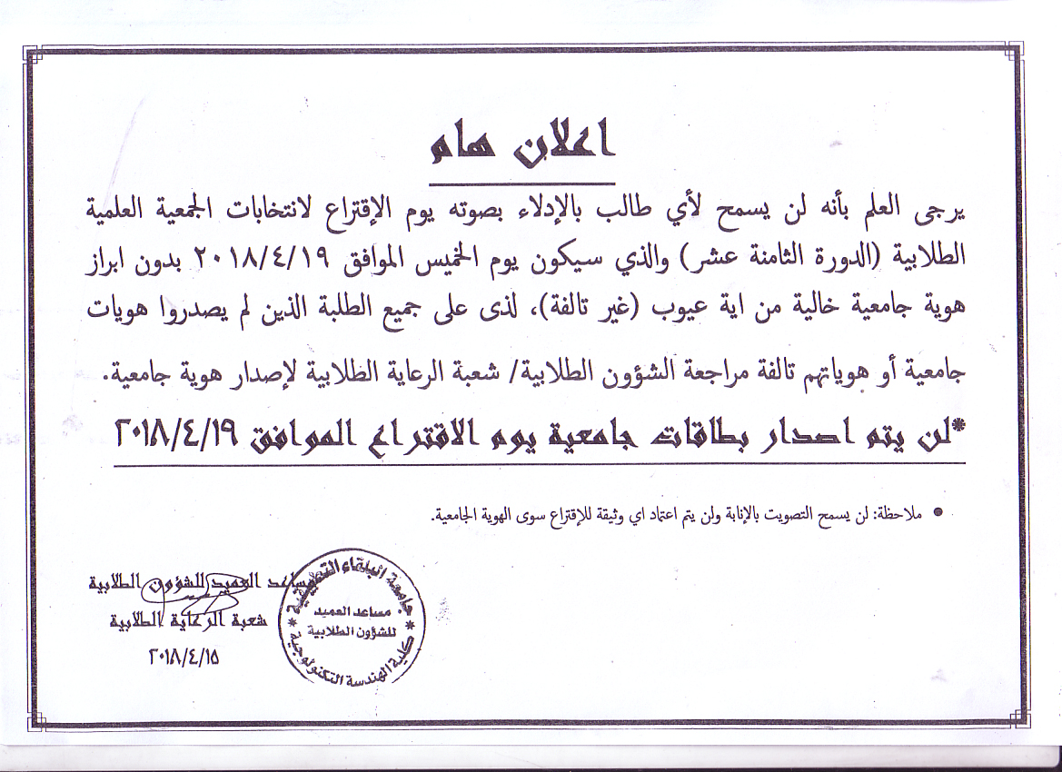 الاعلانات الخاصة بانتخابات الجمعية العلمية الطلابية الدورة الثامنة عشر/ القائمة النهائية + اماكن الاقتراع