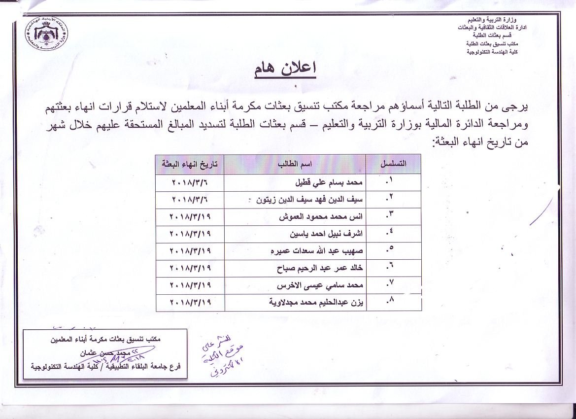 يرجى من الطلبة التالية أسماؤهم مراجعة مكتب تنسيق بعثات مكرمة ابناء المعلمين لاستلام قرارات انهاء بعثتهم ومراجعة الدائرة المالية بوزارة التربية والتعليم - قسم بعثات الطلبة لتسديد المبالغ المستحقة عليهم خلال شهر من تاريخ انهاء البعثة :