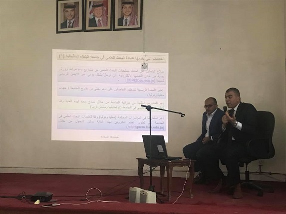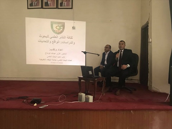 القى الأستاذ الدكتور غازي وشاح نائب عميد البحث العلمي في جامعة البلقاء التطبيقيه محاضره في كلية الاميره عاليه الجامعيه عن النشر الالكتروني واوضح الدكتور الوشاح بان الموضوع في غاية في الأهمية لكل طالب علم يسعى لشق طريقه في سُبل العلم والمعرفة وصولاً للدارسات العليا لينتفع منها الآخرين فعمادة البحث العلمي في جامعة البلقاء التطبيقية تقدم خدماتها لكل باحث يسعى لنشر علمه.
