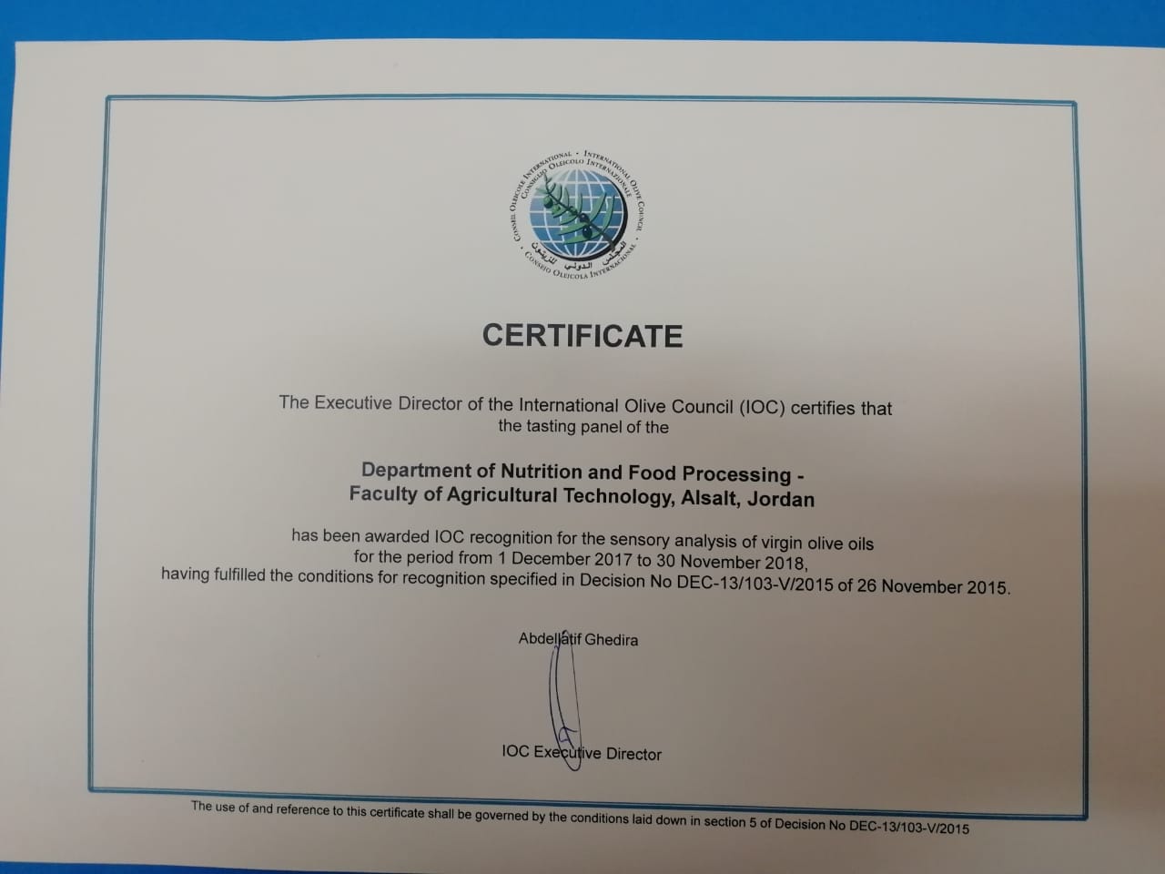 حصلت جامعة البلقاء التطبيقية ومن خلال قسم التغذية والتصنيع الغذائي في كلية الزراعة التكنولوجية على شهادة المجلس الدولي للزيتون (IOS ) في اسبانيا لتقييم وتصنيف زيت الزيتون عالميا من النواحي الحسية والكيماوية .