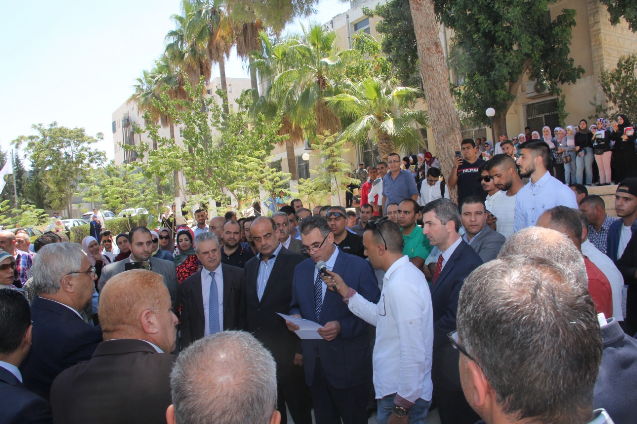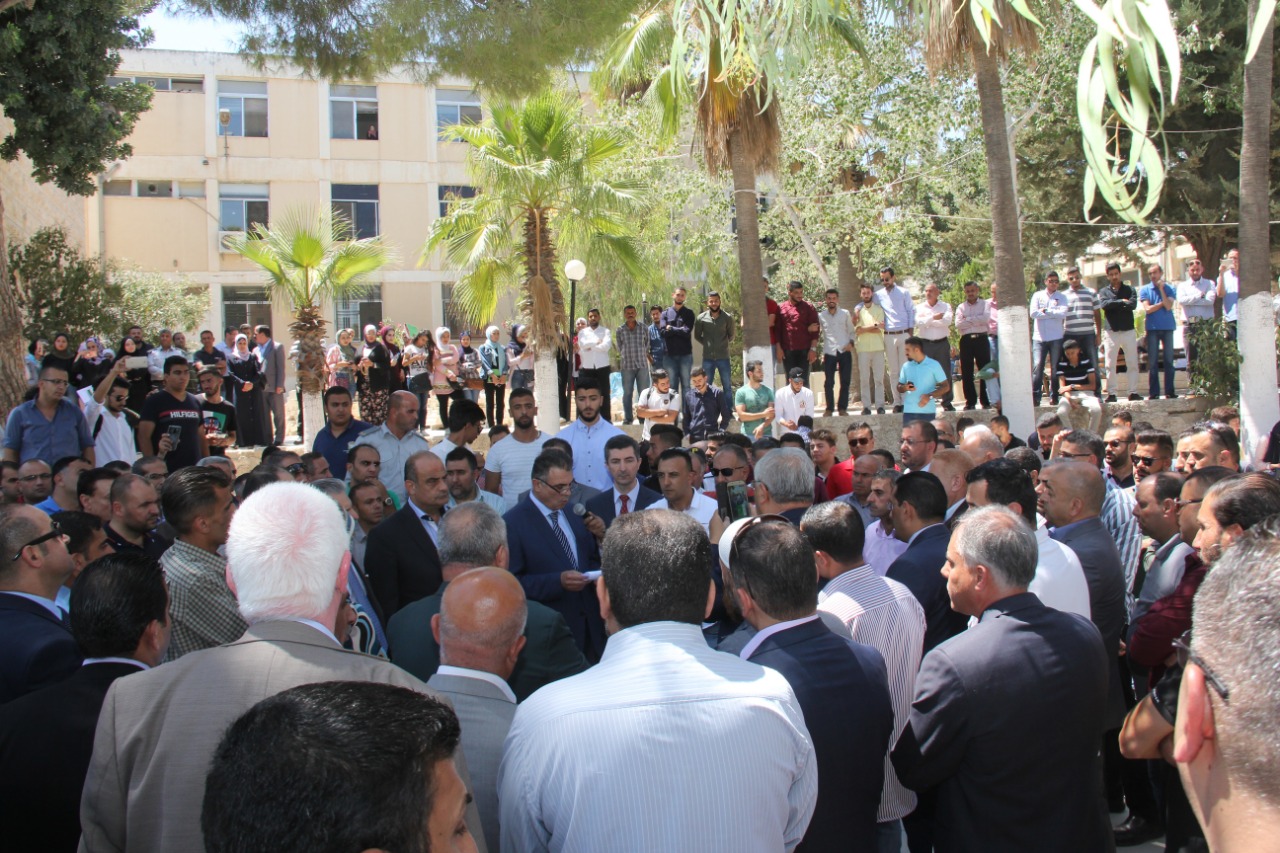 نقف اليوم في جامعة الوطن جامعة البلقاء التطبيقية ،" وقفة وطن " مع شهداء الوطن وشهداء إرتقوا من أرض البلقاء وهم يقدمون أرواحهم من أجل الوطن للدفاع عن الارض والعرض من مجموعات ارهابية ، مجرمين ، وقتلة ، وخونة، ونقف مع الجرحى الذين أصيبوا وهم يقاتلون المجموعات الظلامية ، التكفيرية ، والتي ليس لها مبدأ إلا خيانة الوطن والتآمر عليه مع قوى الشر والطغيان .
