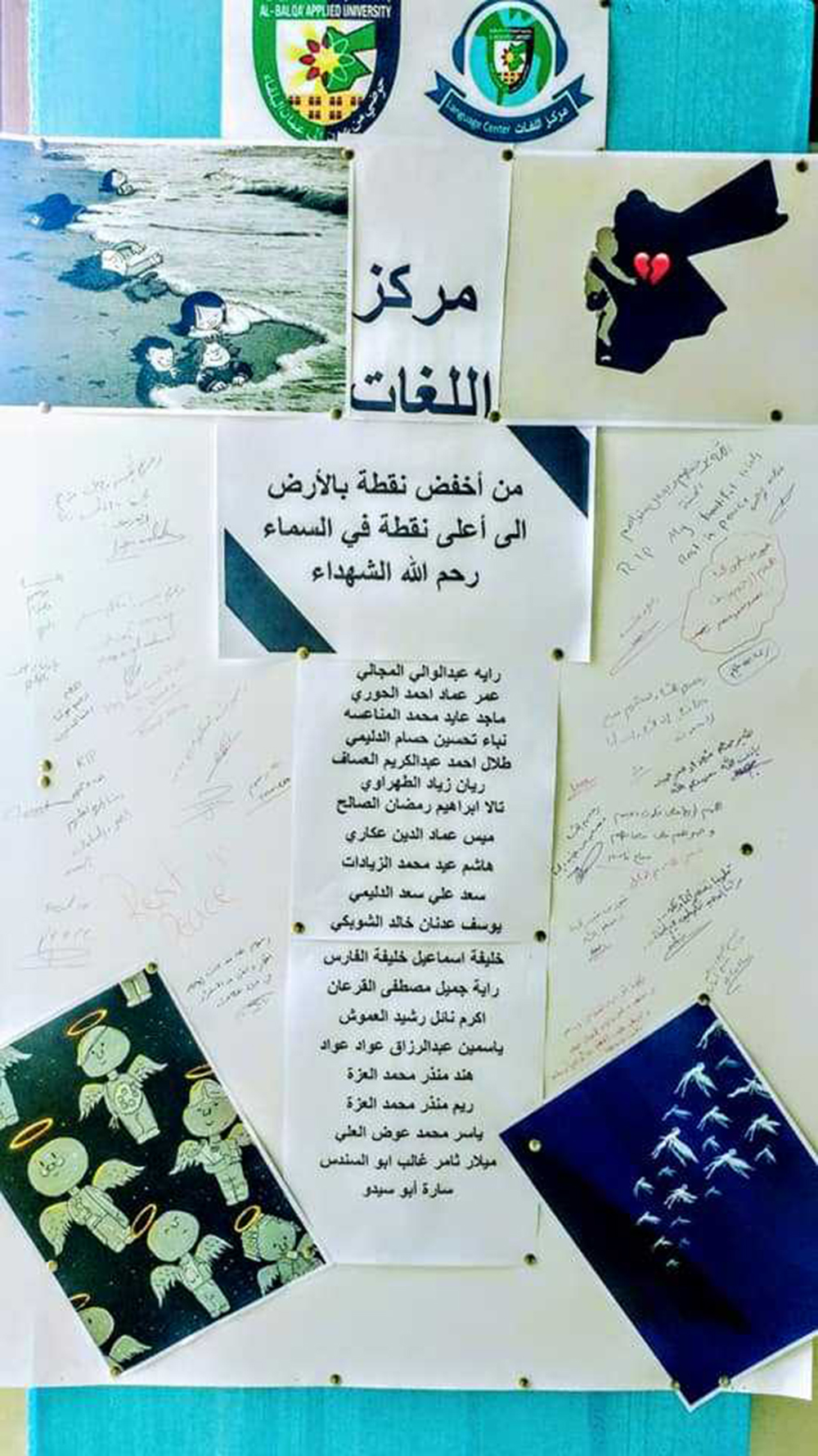 قام مركز اللغات بعمل "جدارية عزاء" تضامناً مع أسر الضحايا لحادثة البحر الميت, حيث قام الطلاب بالتوقيع على الجداريه و التعبير عن مشاعر الحزن و مشاركتهم العزاء للمتوفيين والتمنيات بالشفاء العاجل للمصابين.