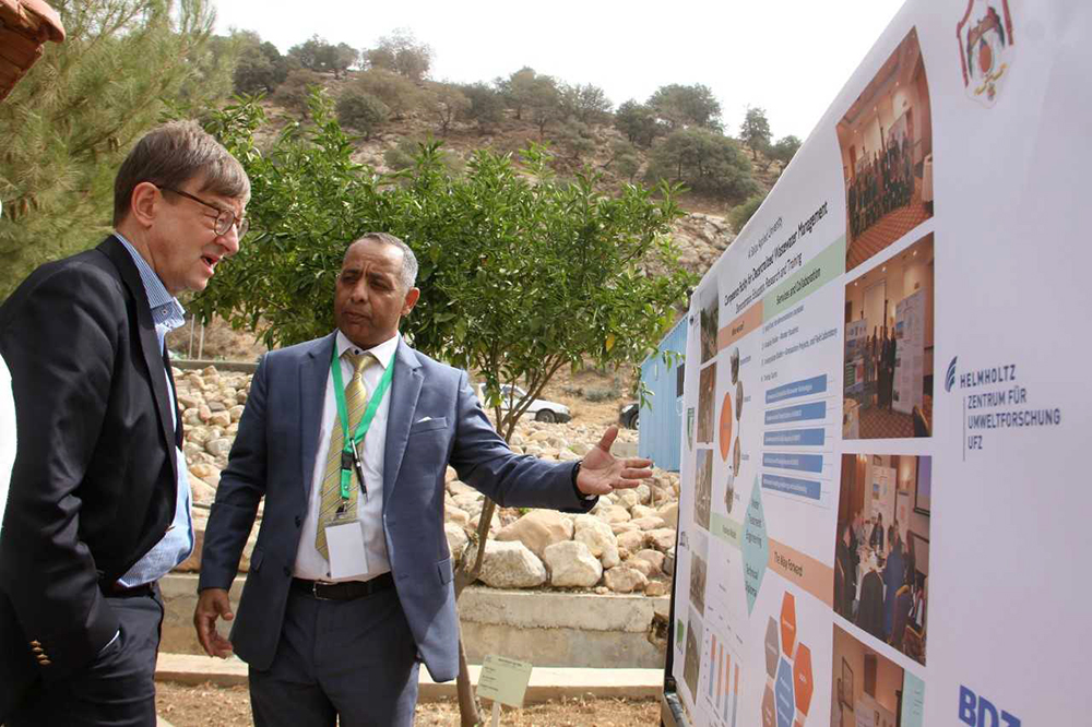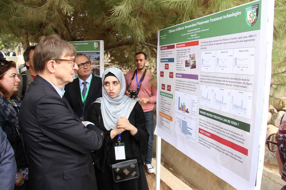 وخلال الزيارة، اطلع الوفد الذي ترأسه مدير مركز "هيلمهولتز" الاستاذ الدكتور أوتمار فيستلر، على المنشأة النموذجية لإدارة المياه العادمة التي أنشأتها الجامعة قرب مدينة الفحيص من خلال مشروع "سمارت" والممول من الوزارة الاتحادية الألمانية للتعليم والبحوث بالشراكة مع مركز "هيلمهولتز" وبالتعاون مع وزارة المياه والري الأردنية.