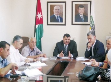 رئيس الاتحاد الرياضي للكليات الدكتور ابراهيم العدوان (وسط) يتحدث في المؤتمر الصحفي أمس