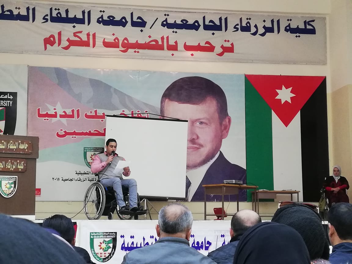 استضافت كلية الزرقاء الجامعية /جامعة البلقاء التطبيقية انطلاق مبادرة "أنا إنسان" والتي تعنى بذوي الإعاقة الحركية بالتعاون مع هيئة شباب كلنا الأردن حيث أكدت الدكتورة رانيا القروم النائب الأكاديمي مندوبة عن عميد كلية الزرقاء على أن الكلية تسعى دائما لخدمة ذوي الإعاقة وتلمس حاجاتهم والسعي لكل ما من شأنه تمكين ودمج ذوي الإعاقة.