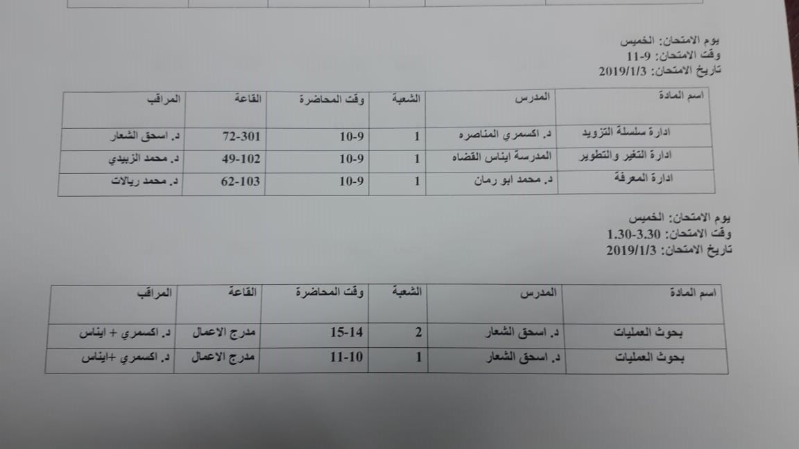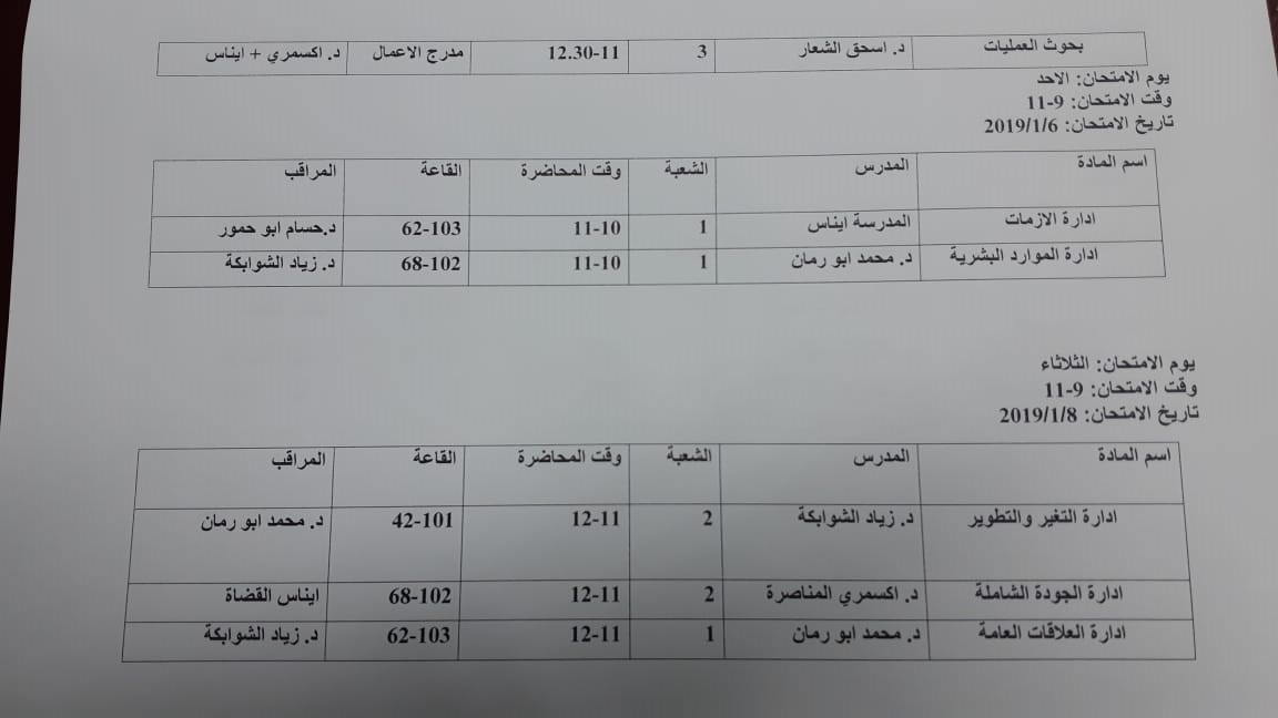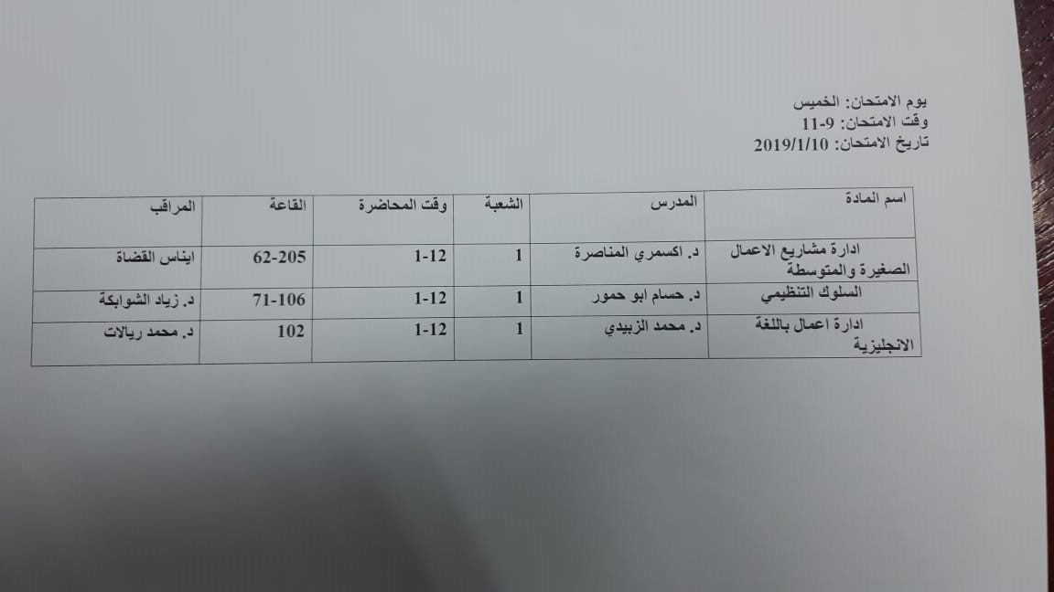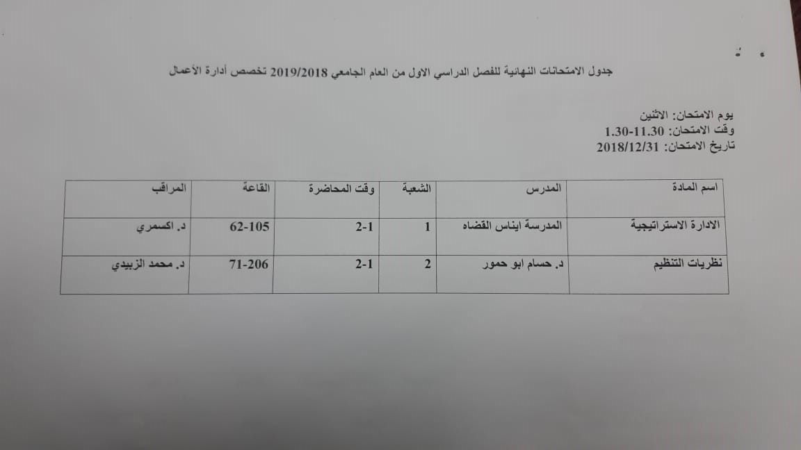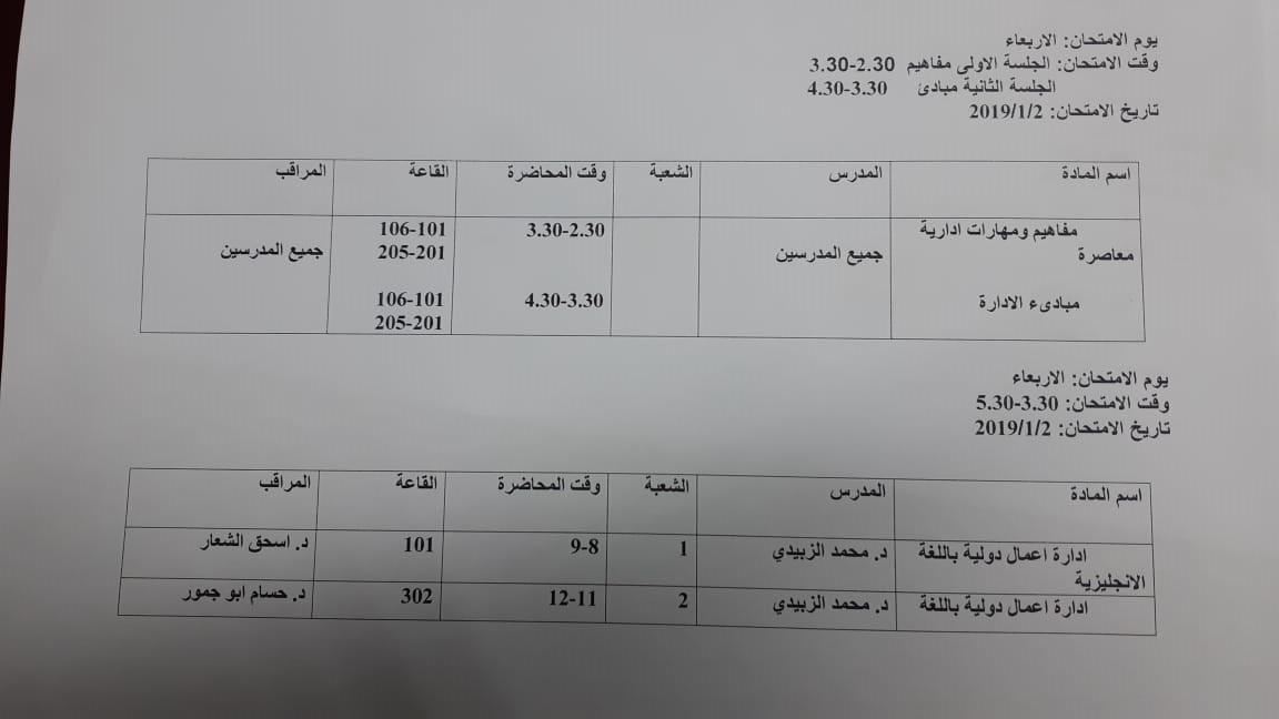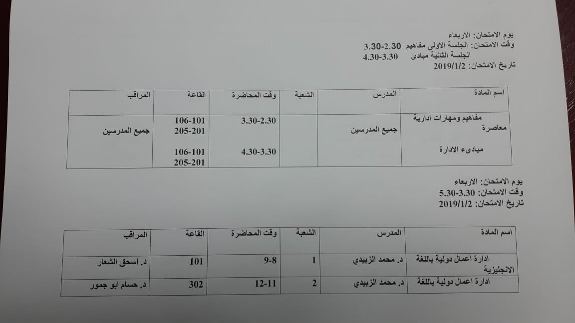 اعلان برنامج امتحانات قسم ادارة الاعمال- كلية الاعمال