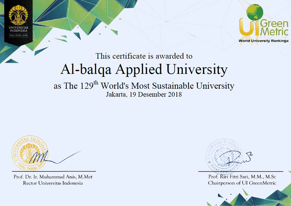 أعلن رئيس جامعة البلقاء التطبيقية الأستاذ الدكتور عبدالله سرور الزعبي عن حصول الجامعة على المركز الأول محلياً للعام الثاني على التوالي في تصنيف UI Green MetriC العالمي للعام 2018 الخاص بالجامعات الخضراء، كما حصلت على المركز الثاني عربياً.