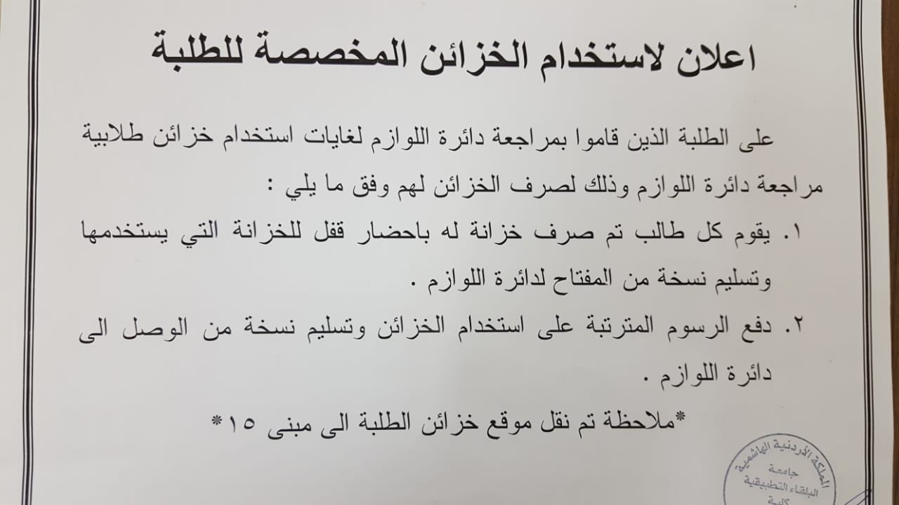 اعلان لاستخدام الخزائن المخصصة للطلبة