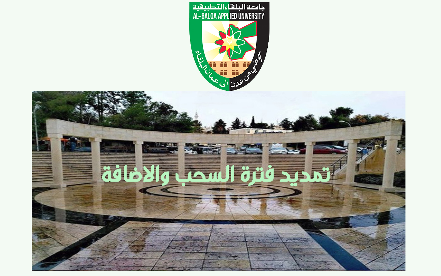 يعلن المسجل العام في جامعة البلقاء التطبيقية عن تمديد فترة السحب والاضافة ( للطلبة الغير مسجلين ) وذلك لنهاية دوام يوم الخميس الموافق 31 / 1 / 2019