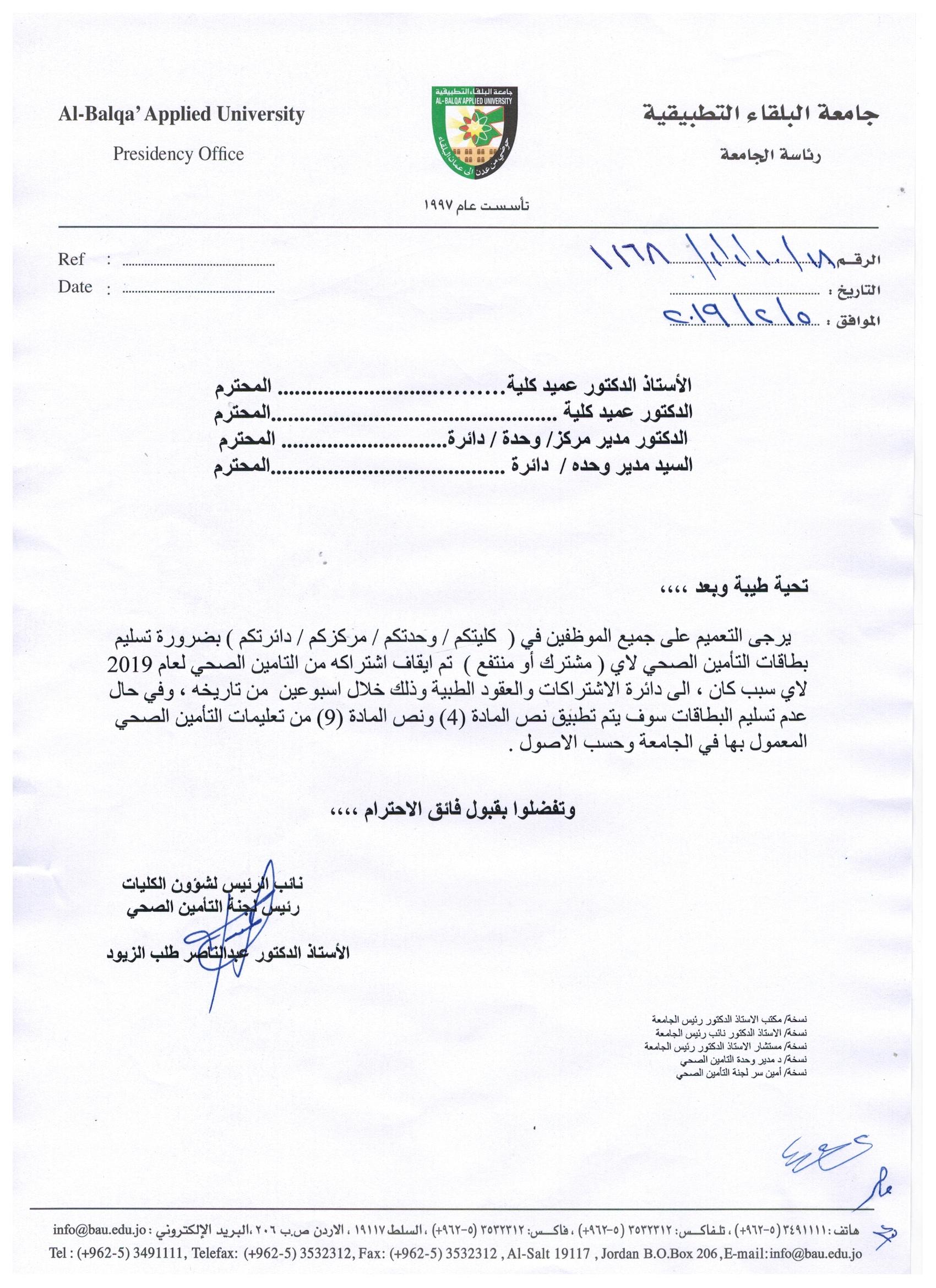 يرجى التقييد بما ورد بالكتاب 18/10/1/1/1168 المتضمن التعميم بضرورة تسليم بطاقات التامين الصحي لاي (مشترك/منتفع ) تم ايقاف اشتراكة من التامين الصحي لعام 2019