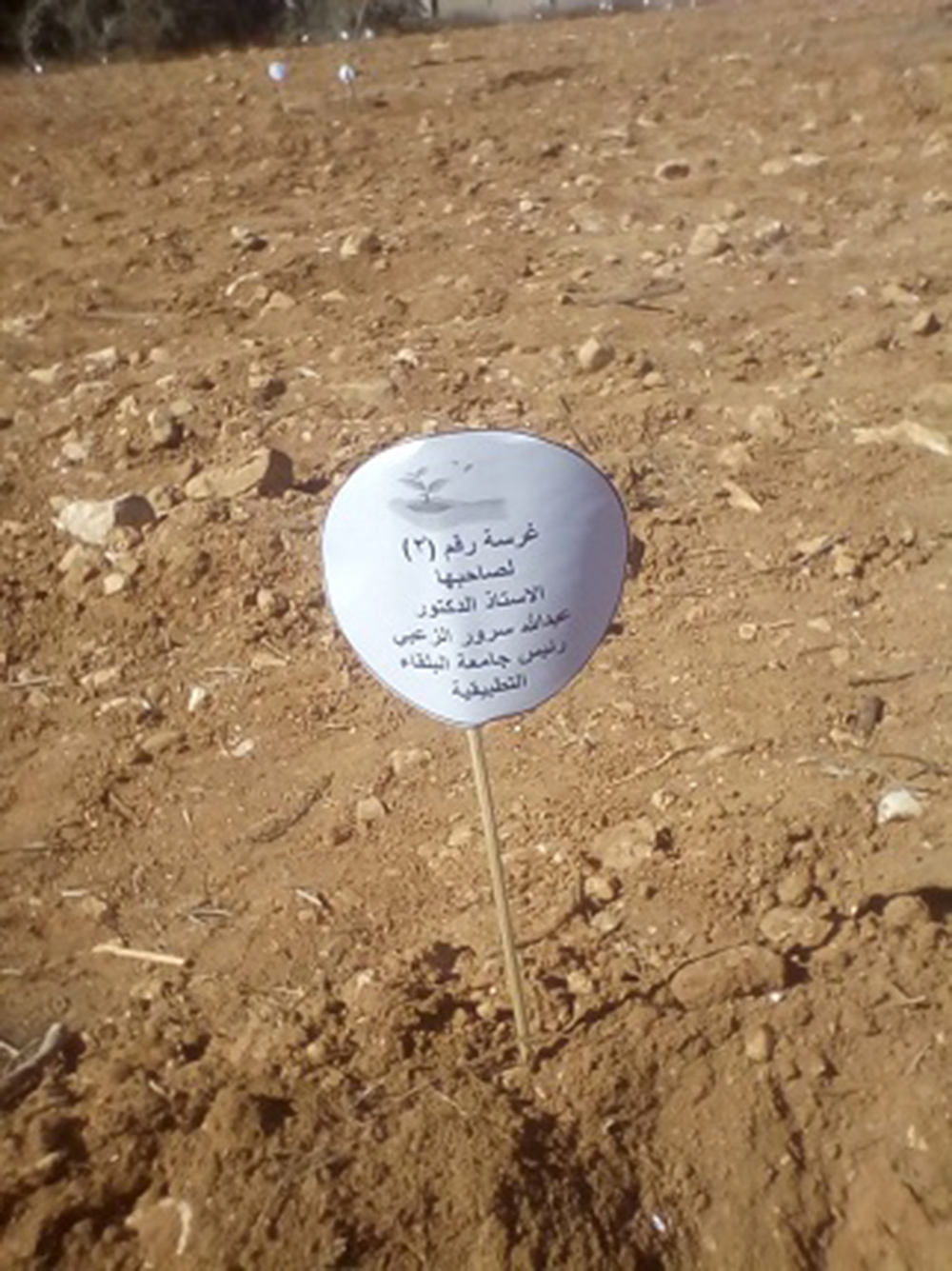 3. الثالثة للاستاذ الدكتور عبدالله سرور الزعبي رئيس جامعة البلقاء التطبيقية وتم زراعتها من قبل عطوفة الاستاذ الدكتور حمدان العواملة نائب الرئيس لشؤون الاستثمار.