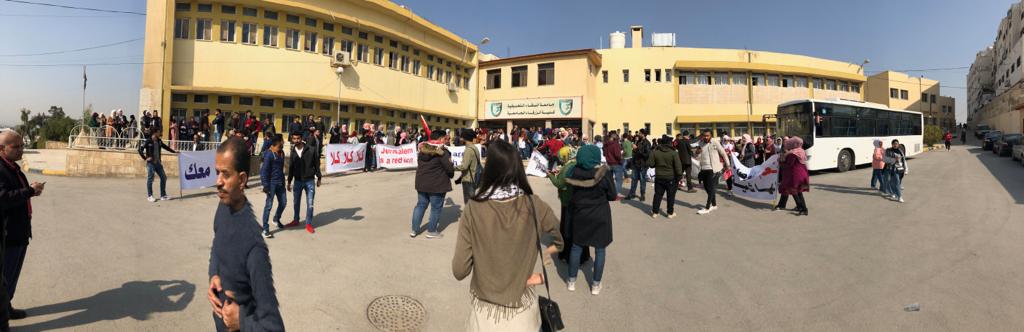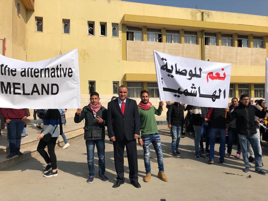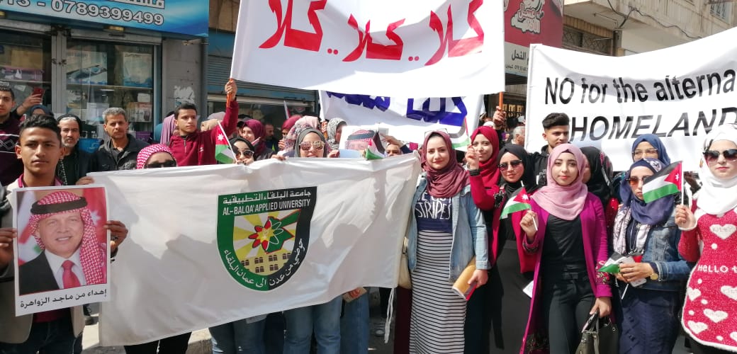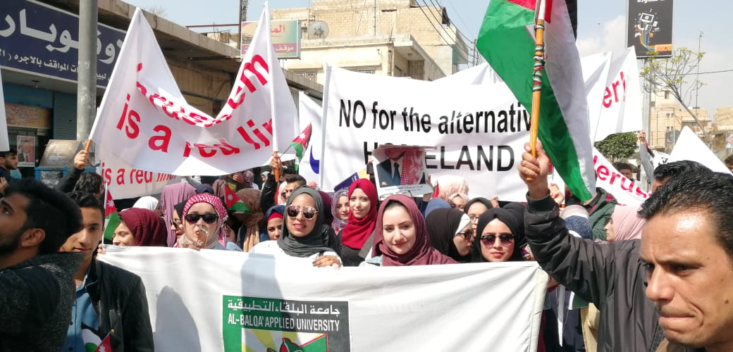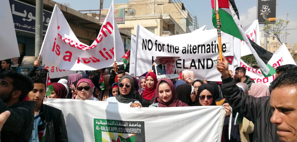 ورفع المشاركون خلال المسيرة التي شارك فيها الفاعليات الرسمية والشعبية ومؤسسات المجتمع المدني والمؤسسات التعليمية والجمعيات يافطات كتب عليها : لا لصفقة القرن ، القدس خط احمر ، لا للوطن البديل ،نعم للوصاية الهاشمية على المقدسات الاسلامية والمسيحية .