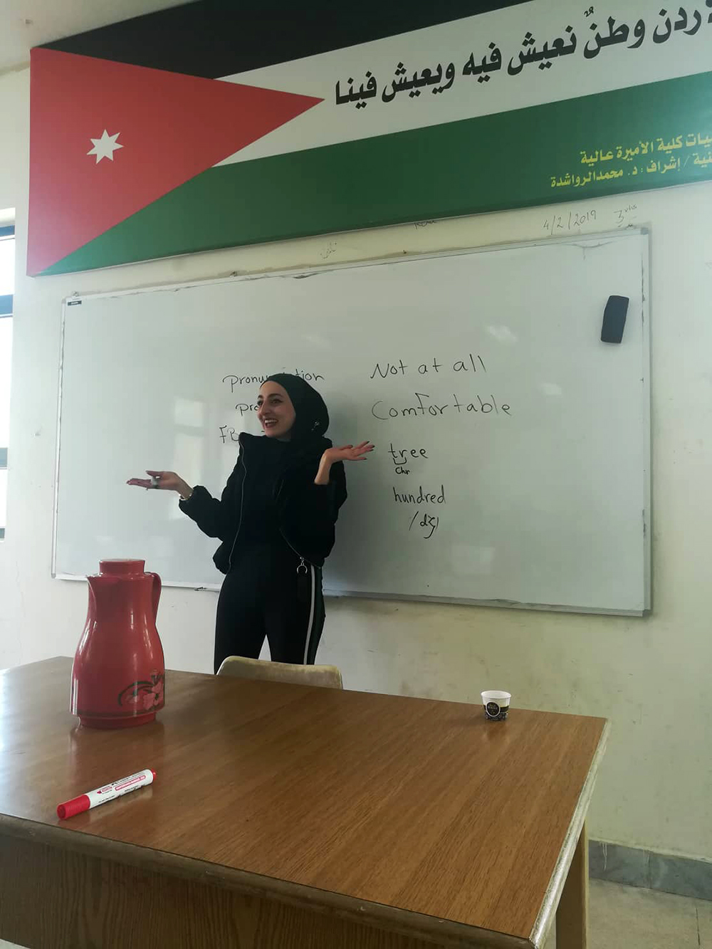 وتحدثت المدربة ياسمين الشياب من أكاديمية جاز- Jaz ACADEMY- والتي هي طالبة متميزة من طالبات جامعة البلقاء التطبيقية التي دفعها حبها للغة الانجليزية واستثمارها لخبرات مدرسي قسم اللغة الانجليزية وآدابها في الجامعة وكلية الأميرة عالية الجامعية لصقل شغفها والبحث بأسرار اللغة الانجليزية التي باتت لغة التواصل العالمية والأوسع انتشارًا بين دول العالم