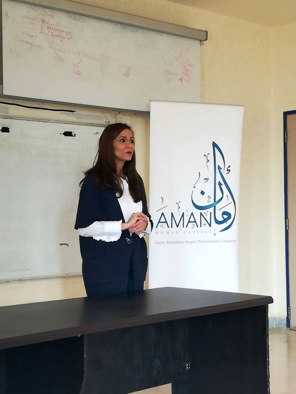 وتحدثت في المحاضرة سالي ابوعلي مدير مؤسسة مبادرة أمان (HUMAN CAPITA) من وكالة الاستشارات والتدريب أمان حيث اشارت  الى ان المبادرة تهدف لرفع سوية بيئة العمل و استثمار الكفاءات والموارد البشرية وأهمية التوظيف الصحيح لروافد الخريجين المتميزين لضمان النجاح والاستمرارية ضمن المنافسة الشديدة الحاصلة في سوق العمل مشيره الى أهمية توعية الخريجين بحقوقهم  وواجباتهم وتحدثت السيدة ابو علي  عن سلسلة من المهارات المنوعة الخاصة الواجب على الخريج اتقانها ككيفية الانخراط في سوق العمل ،والطريقة السليمة للبحث عن الوظيفة المناسبة والاستمرار في حضور ورشات التدريب وتطوير الذات من اجل اكتساب المعرفة والخبرات القيمة منوها الى ضرورة الالتزام بتطوير مهارات التواصل وتنظيم الوقت والسلوك العملي والذي يتحقق بالاحتكاك والتفاعل مع الأفراد والمؤسسات الأخرى