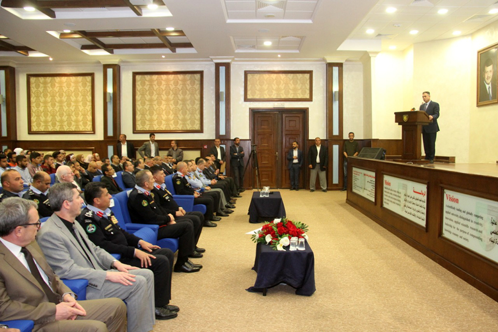 وفي محاضرة أمام عدد من طلبة الجامعة والهيئة التدريسية حول الأمن المجتمعي وسيادة حكم القانون، أكد اللواء الحمود الدور المهم الذي يؤديه الشباب في المجتمع والذين هم محط وعناية جلالة القائد الأعلى الملك عبد الله الثاني والمورد البشري للأردن ومستقبله وعليهم تعول الدولة الكثير من الآمال والطموحات في نهضتها وازدهارها. وبين أن التطور المستمر في قدرات وإمكانات مديرية الأمن العام، وكافة الأجهزة الأمنية في مختلف المجالات لم يكن ليتحقق لولا اهتمام ومتابعة وإشراف مباشر من لدن قيادتنا الحكيمة، وحرصها دوماً على تطوير الاداء واحداث التغيير الدائم في العمل الشرطي والامني ومواكبة الجريمة وملاحقتها بأحدث الاساليب العملية والتكنولوجية الحديثة، وتقديم افضل الخدمات الشرطية والامنية والانسانية للمواطن والمقيم على الارض الاردنية.
