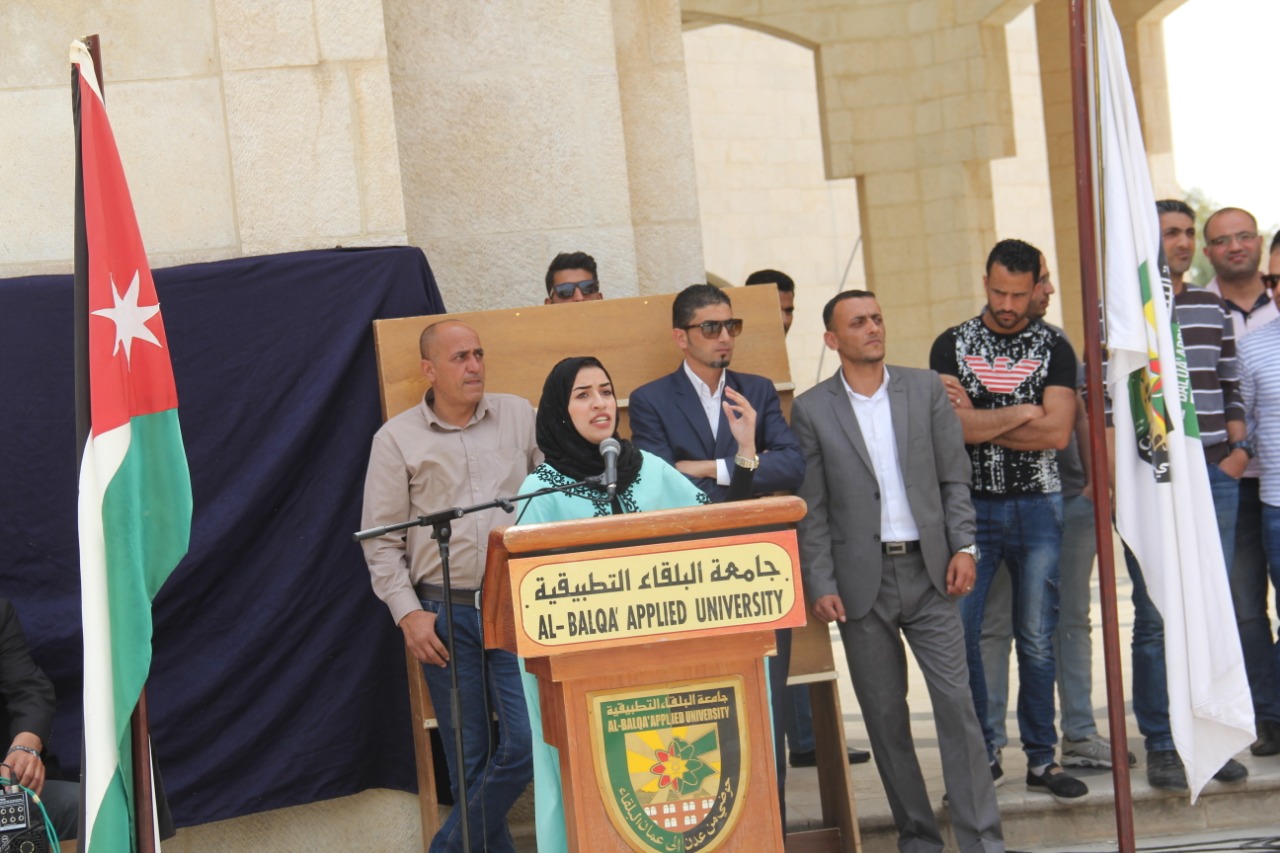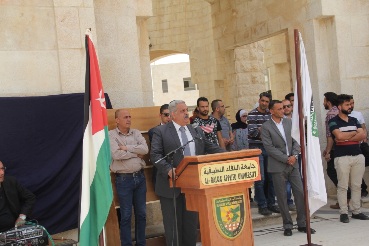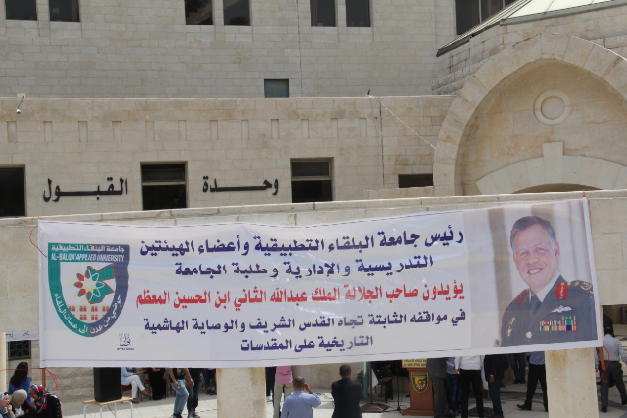 مندوبا عن الاستاذ الدكتور عبدالله سرور الزعبي رئيس جامعة البلقاء التطبيقية رعى الاستاذ الدكتور غاندي انفوقه نائب الرئيس للشؤون الاكاديمية فعاليات الاحتفال بالقدس عنوانا للوصاية الهاشمية بحضور الدكتور معاذ الحياري عميد شؤون الطلبة وطلبة الجامعة . والقى الدكتور معاذ الحياري كلمة قال فيها اننا في جامعة البلقاء التطبيقية نقف وقفة عز وفخار خلف جلالة الملك عبدالله الثاني ابن الحسين المعظم في مواقفه تجاه القدس والمقدسات الاسلامية والمسيحية في القدس الشريف مؤكدا على ان القدس عربية وستبقى عربية ووصايتها هاشمية وراسخة منذ عهد الشريف الحسين بن علي وحتى عهد سيد البلاد المفدى جلالة الملك عبدالله الثاني ابن الحسين حفظه الله ورعاه . والقت الطالبة هبة ابوحسان رئيسة نادي الخدمة العامة قصيدة بعنوان التأشيرة عبرت فيها عن مواقف جلالة الملك عبدالله الثاني ابن الحسين تجاه القدس والمقدسات وتأكيد الهوية العربية والإسلامية لها والوصاية الهاشمية التاريخية على المقدسات فيها. كما كان للطالبة يقين المواجده ويزيد العياصره واسيل العمر وبلال المعاني قصائد شعرية عبروا فيها عن الفخر والاعتزاز بالمواقف الهاشمية تجاه القدس والمقدسات الاسلامية والمسيحية بالقدس.