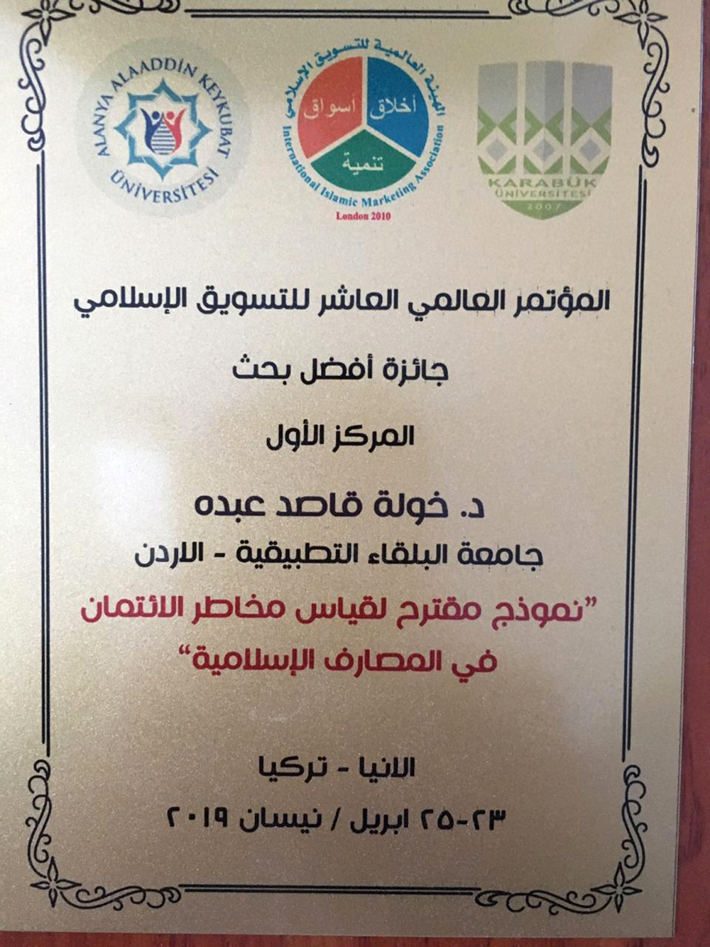 حصلت الدكتورة خوله قاصد عبده عضو هيئة التدريس في جامعة البلقاء التطبيقية – كلية الأعمال على المركز الأول لأفضل بحث مقدم للمؤتمر الدولي العاشر للتسويق الإسلامي الذي أقيم مؤخرا في تركيا حيث قدمت الباحثة ورقة بعنوان: نموذج مقترح لقياس مخاطر الائتمان في المصارف الإسلامية.