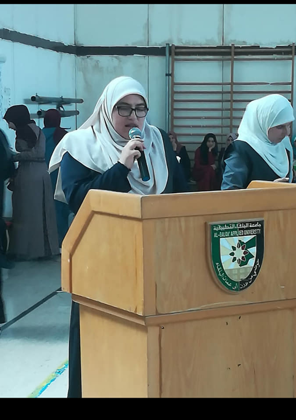 تبعها اعلان انطلاقة الجمعية العلمية الطلابية حيث تقدمت رئيسة الجمعية الطالبة رمز القرالة بكلمة ترحيبية بالحضور والمشاركين في الحفل وعن حماسها بخوض الانتخابات الطلابية ووعيها وادراكها بأهمية وثقل مسؤوليتها لخدمة الطالبات من خلال الجمعية.