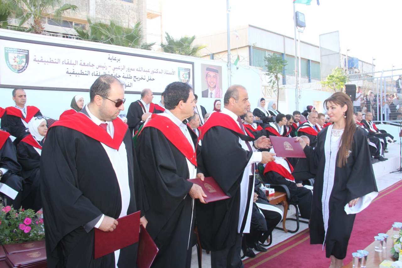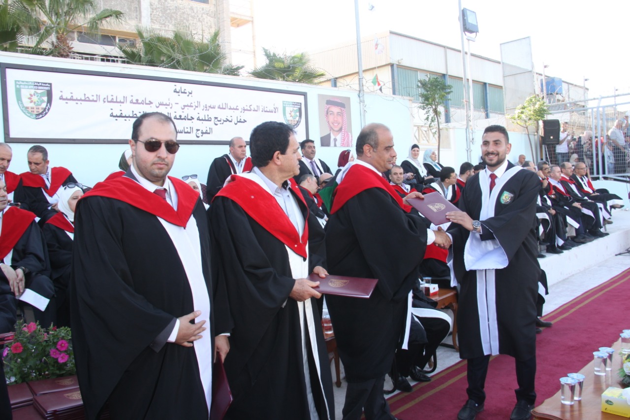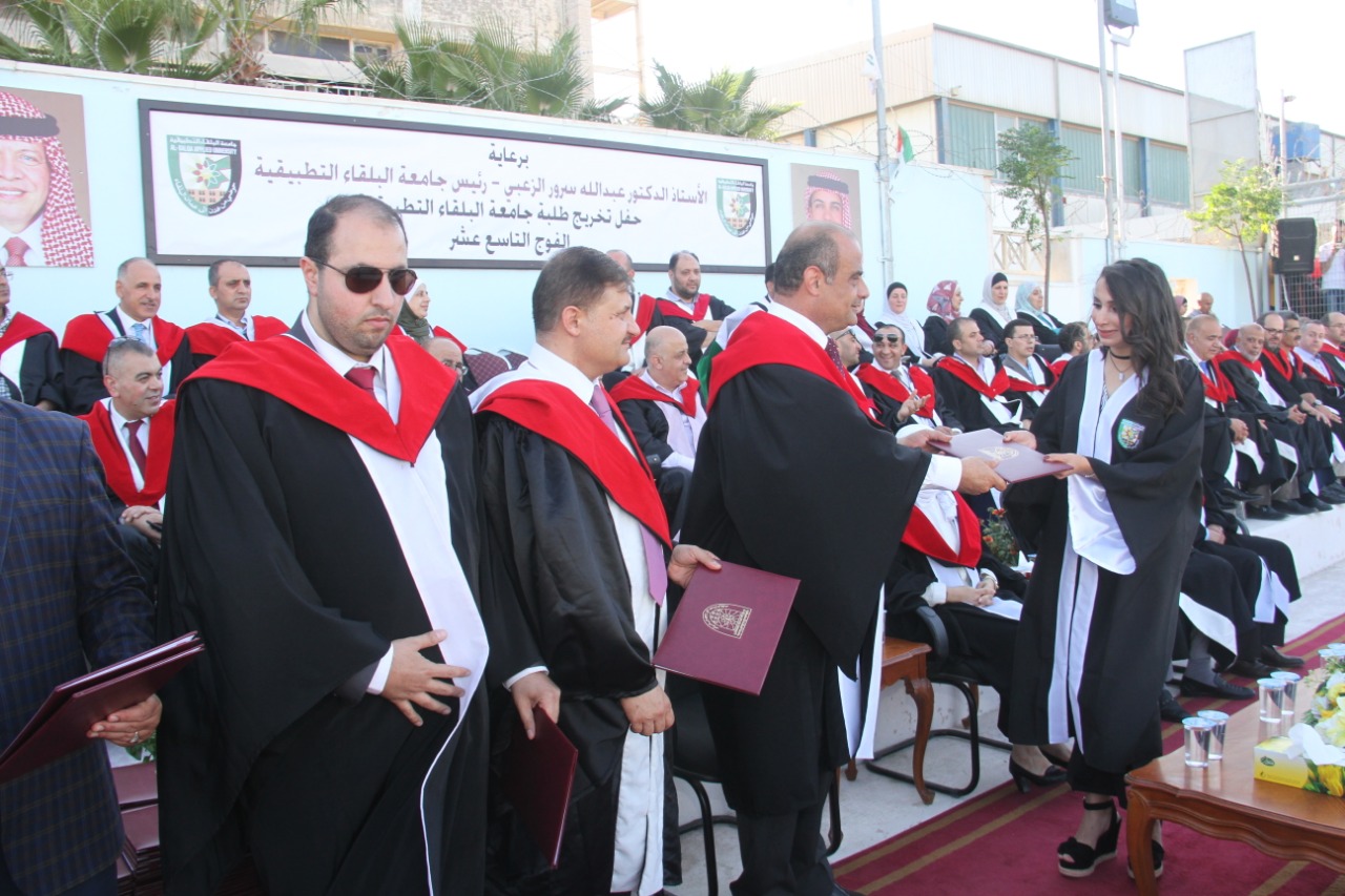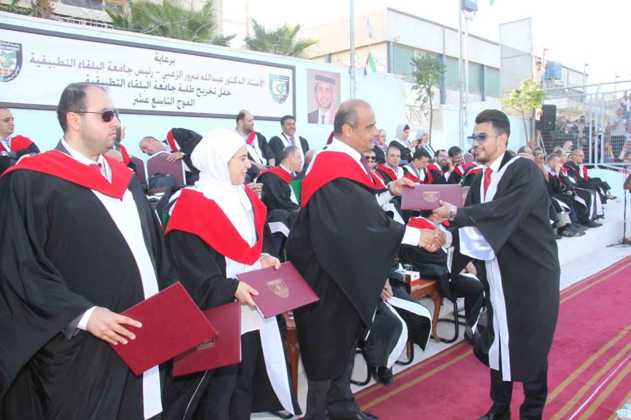 انطلقت مساء اليوم الثلاثاء 23/7/2019 احتفالات جامعة البلقاء التطبيقية بتخريج الفوج التاسع عشر من طلبة كليات الاعمال والزراعة التكنولوجية والامير عبدالله بن غازي للاتصالات و تكنولوجيا المعلومات برعاية مندوب رئيس الجامعة الاستاذ الدكتور عبدالله سرور الزعبي نائب الرئيس للشؤون الإدارية عميد كلية الاعمال الاستاذ الدكتور جمال النسور. وسلم الاستاذ الدكتور جمال النسور في الحفل الذي اقيم على ملعب الجامعة في السلط وحضره عميد كلية الزراعة التكنولوجية الاستاذ الدكتور سميح ابو بكر وعميد كلية الأمير عبدالله بن غازي للاتصالات وتكنولوجيا المعلومات الدكتور خلف ختاتنه وأعضاء الهيئة التدريسية في الكليات الثلاث وذوو الخريجين سلم الشهادات على الطلبة الخريجين والبالغ عددهم (872) طالبا وطالبة موزعين على كافة التخصصات في الكليات الثلاثة . هذا وتستمر فعاليات احتفالات لمختلف كلياتها لغاية 29/7/2018 ، حيث سيحتضن ملعب الجامعة في السلط فعاليات حفل تخريج كليات المركز وكليات إقليم الوسط وبالتزامن ستقام فعاليات حفل تخريج كليات الشمال في مدينة الحسن الرياضية بالإضافة لتخريج كليات الجنوب حسب برنامج الحفل الذي أعدته اللجنة العليا.