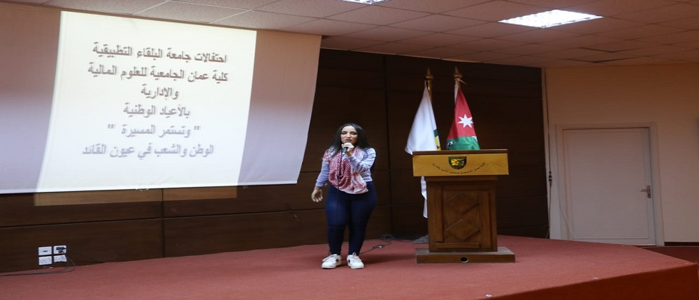 مندوبا عن رئيس جامعة البلقاء التطبيقية الاستاذ الدكتور عبدالله سرور الزعبي رعى الدكتور محمد اللحام عميد كلية عمان الجامعية للعلوم المالية احتفال الكلية بمناسبة الاعياد الوطنية وقال الدكتور اللحام في كلمة ترحيبية ان جامعة البلقاء التطبيقية ومن خلال توجيهات رئيس الجامعة تسعى الى اكساب الطلبة العديد من المهارات والمعارف واشراكهم بالأنشطة التي تعزز مفهوم الانتماء والولاء لديهم من خلال برامج موجهة ومدروسة .