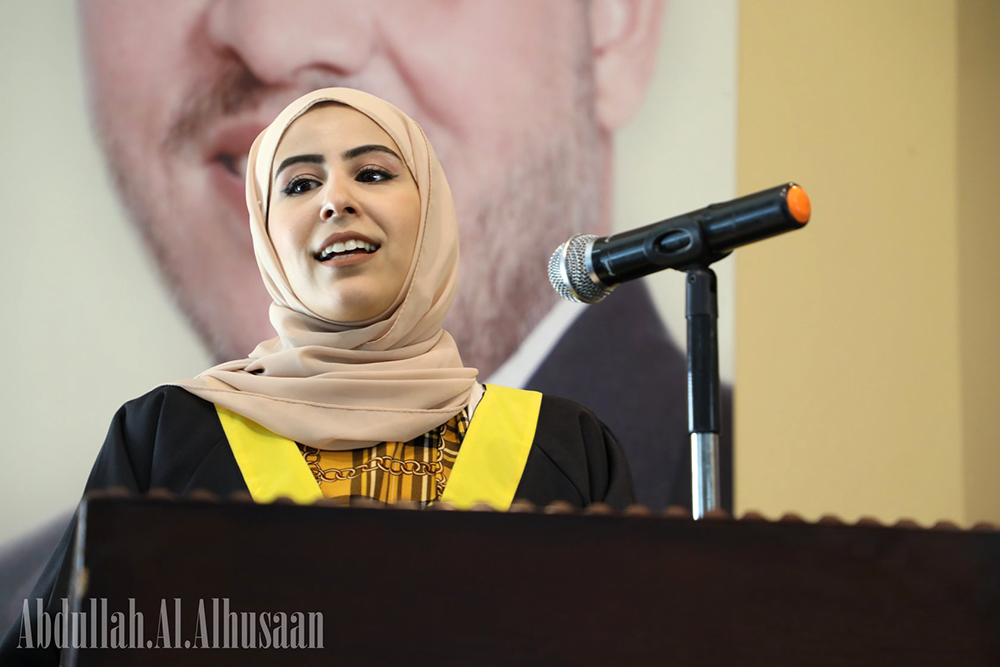 وفي كلمة المتفوقين تقدمت الطالبة ياسمين شاهر الفقير الحاصلة على المركز الأول في المعدل التراكمي في الكلية من تخصص الصيدلة بمعدل (92،5 ) بالشكر والعرفان لعميد الكلية الدكتور سطام الخطيب وراعي الحفل رجل الأعمال فارس عبدالدايم وأعضاء الهيئتين التدريسية والإدارية الذين بذلوا جهود مضنية لاستثمار كل القوى والمعطيات للارتقاء وإيصال العلم والمعرفة لهم والتي نهضت بالكلية علمياً وإدارياً حتى أصبحت من أفضل كليات.