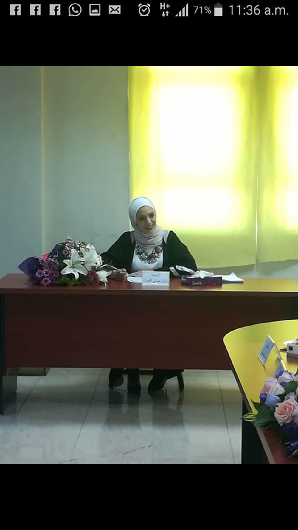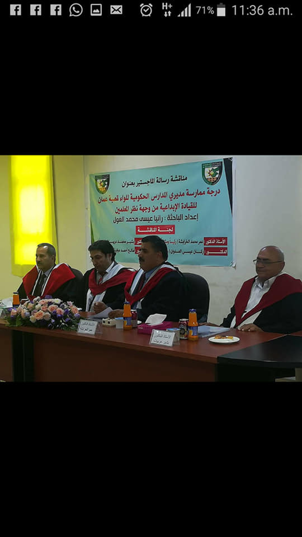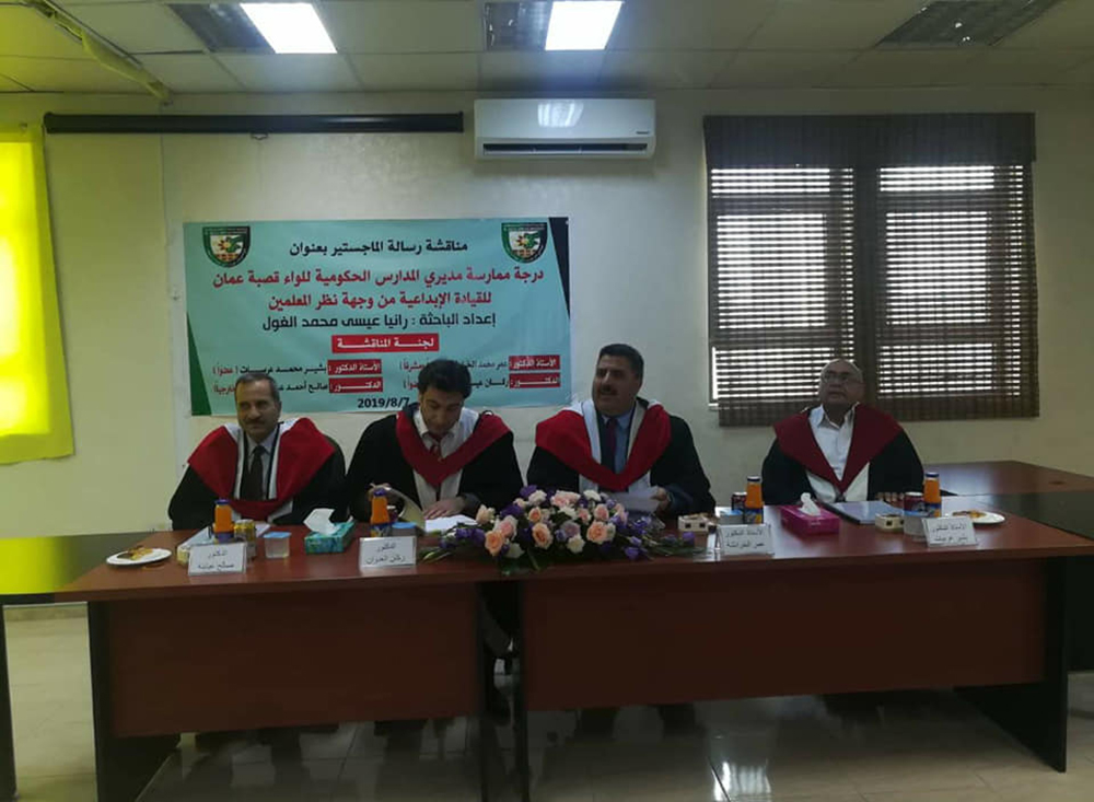 تم في صباح يوم الأربعاء الموافق 2019/8/7، مناقشة رسالة ماجستير للطالبة رانيا عيسى محمد الغول، تخصص الإدارة التربوية، بعنوان (درجة ممارســـة مديري المـــدارس الحكوميـــة للــواء قصبــة عمــان للقيــادة الإبداعية من وجهة نظر المعلــمين).