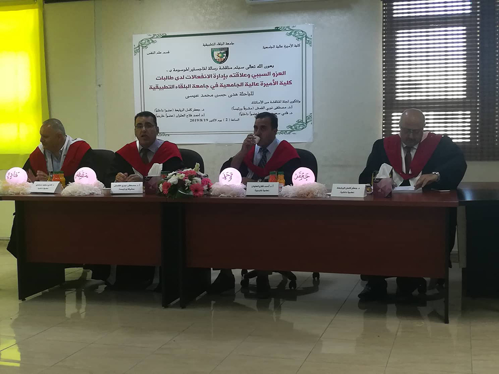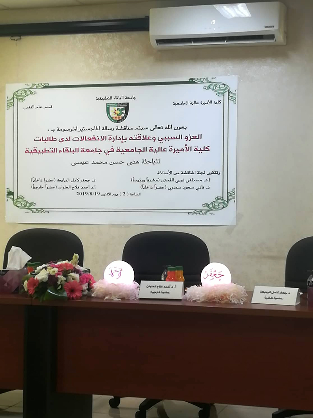 تم في صباح يوم الأثنين الموافق2019/8/19، مناقشة رسالة ماجستير للطالبة هدى حسن محمد عيسى ، تخصص علم النفس التربوي، بعنوان (الغزو السببي وعلاقته بإدارة الانفعالات لدى طالبات كلية الأميرة عالية الجامعية في جامعة البلقاء التطبيقية)