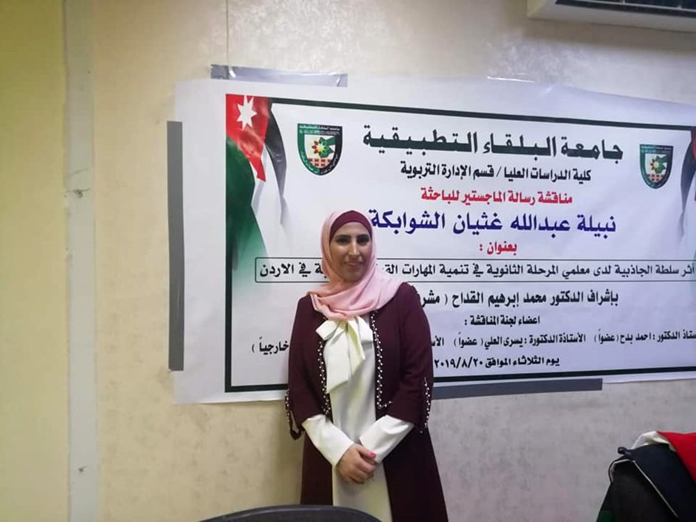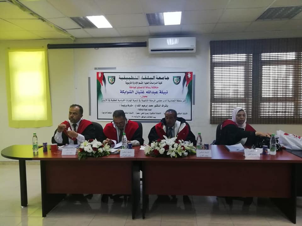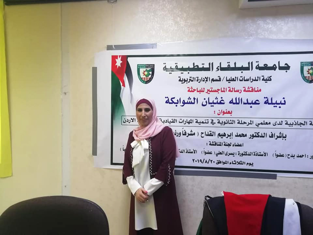 تم في صباح يوم الثلاثاء الموافق20/8/2019، مناقشة رسالة ماجستير للطالبة نبيلة عبدالله غثيان الشوابكة ، تخصص الإدارة التربوية، بعنوان (أثر سلطة الجاذبية لدى معلمي المرحلة الثانوية في تنمية المهارات القيادية للطلبة في الأردن )