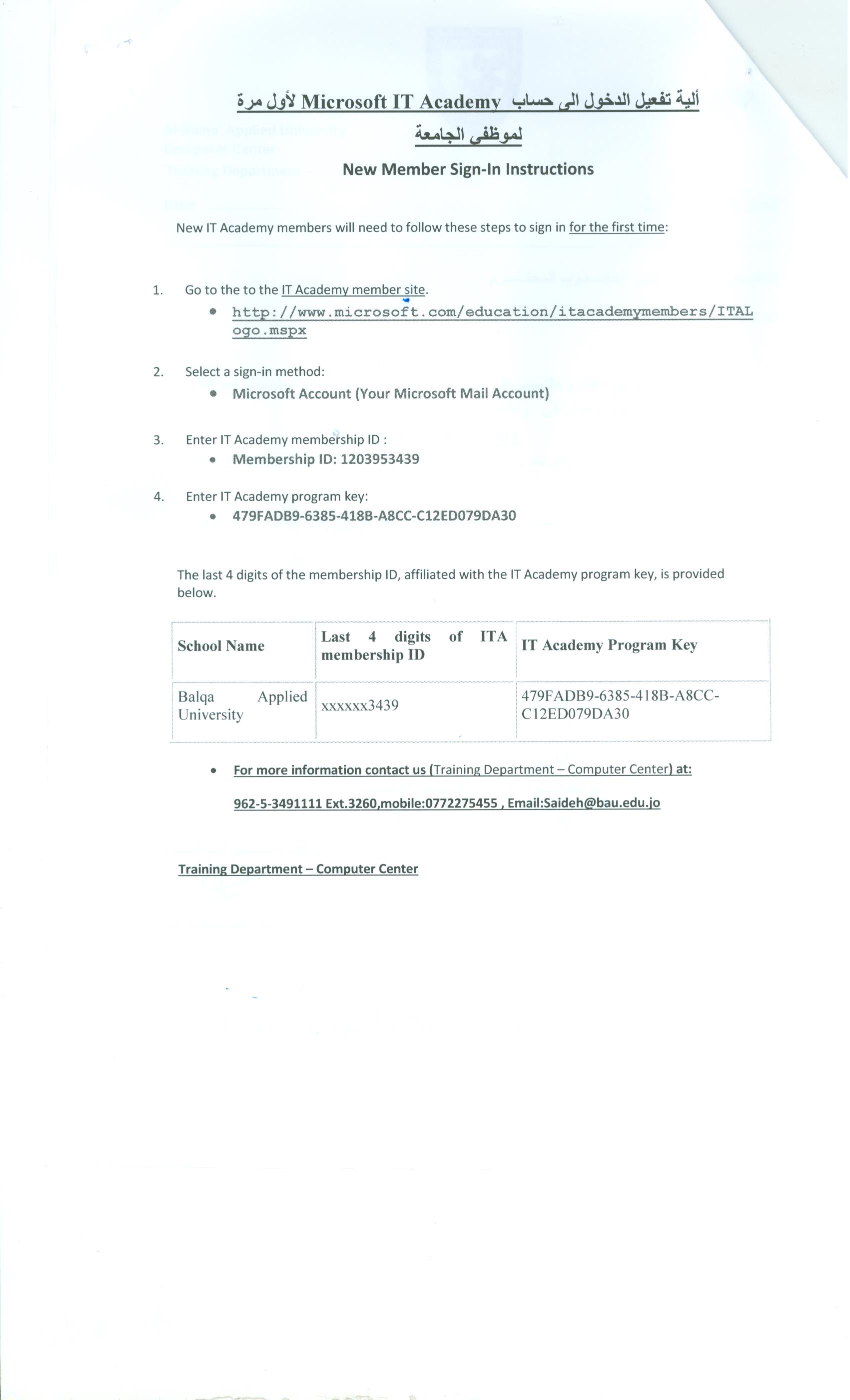 الية تفعيل الدخول الى حساب Microsoft IT Academy لاول مرة لموظفي الجامعة وذلك للاستفادة من الوسائل والمعلومات الموجودة في هذا الموقع راجين اتباع الخطوات المرفقة للتسجيل في الموقع اولا قبل التمكن من الدخول الية والاستفادة منه