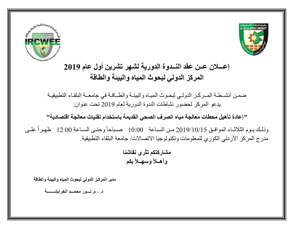 إعلان عن عقد الندوة الدورية بعنوان إعادة تأهيل محطات معالجة مياه الصرف الصحي القديمة باستخدام تقنيات معالجة اقتصادية