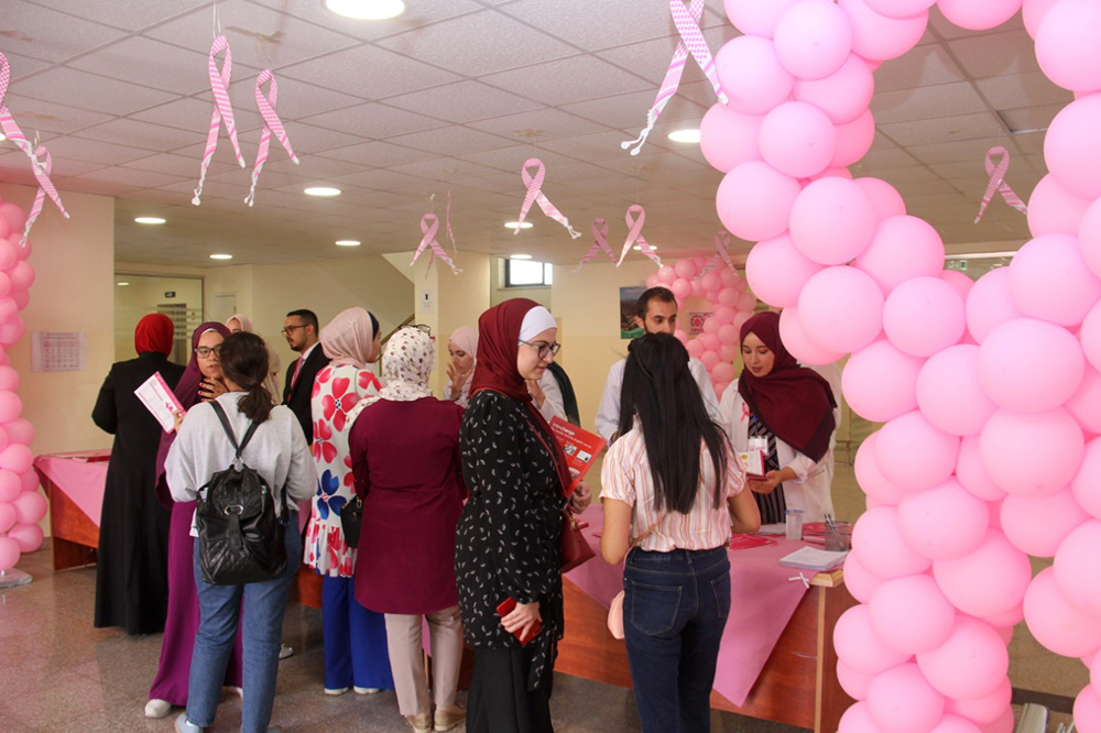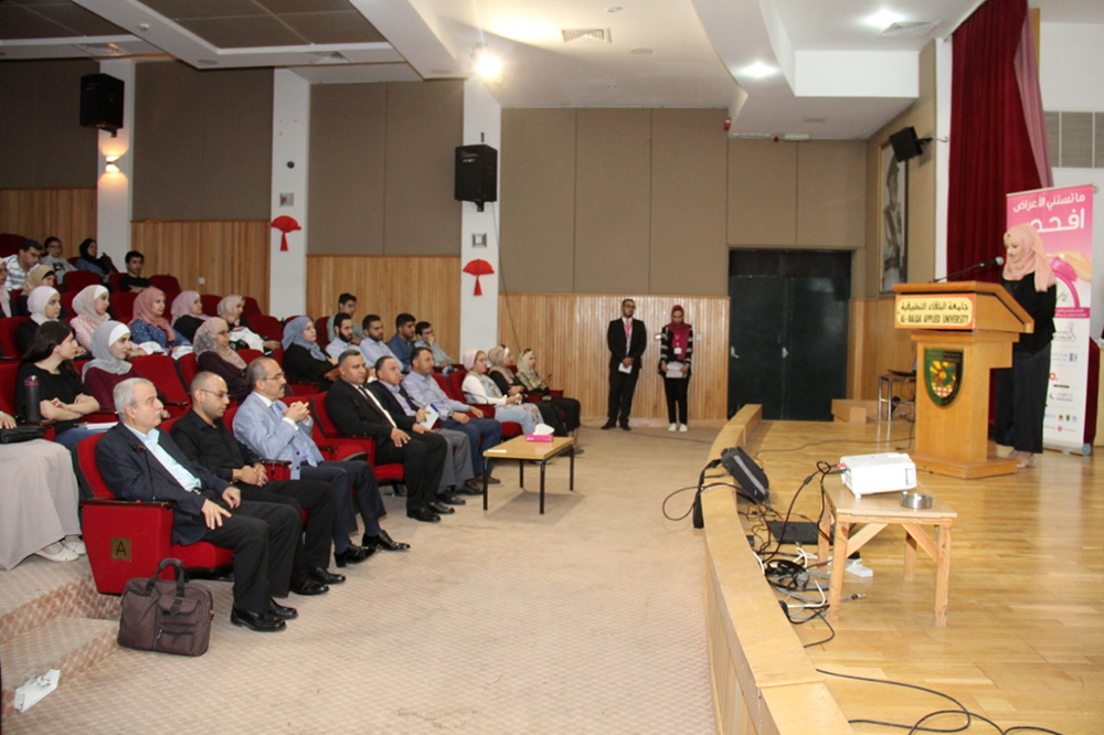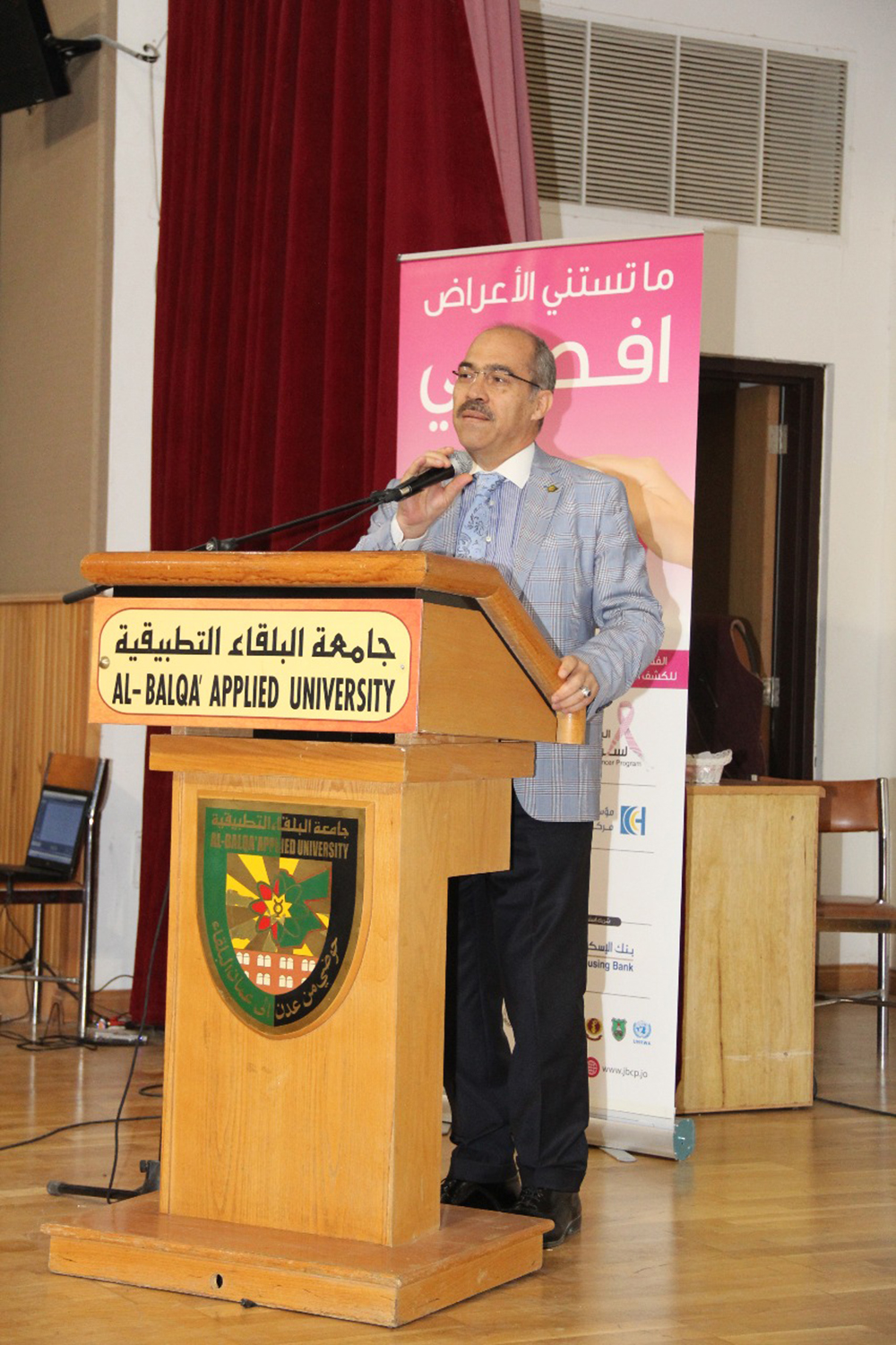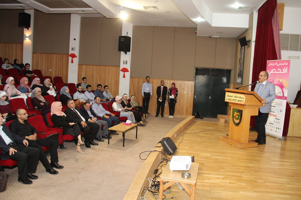 مندوبا عن رئيس جامعة البلقاء التطبيقية الاستاذ الدكتور عبدالله سرور الزعبي رعى نائب الرئيس لشؤون المراكز العلمية عميد كلية الطب الاستاذ الدكتور نضال يونس اليوم الخميس افتتاح فعاليات اليوم الطبي المجاني ( الكشف المبكر عن سرطان الثدي (اليوم الوردي ) والذي تنظمه كلية الطب ويهدف الى نشر الوعي عن اهمية الكشف المبكر عن سرطان الثدي عند النساء ، ويتزامن هذا اليوم مع انطلاق حملات التوعية للكشف المبكر عن سرطان الثدي في شهر أكتوبر من كل عام والذي يطلق عليه "أكتوبر الوردي"، وهي مبادرة عالمية تحمل شعار الشريط الوردي.