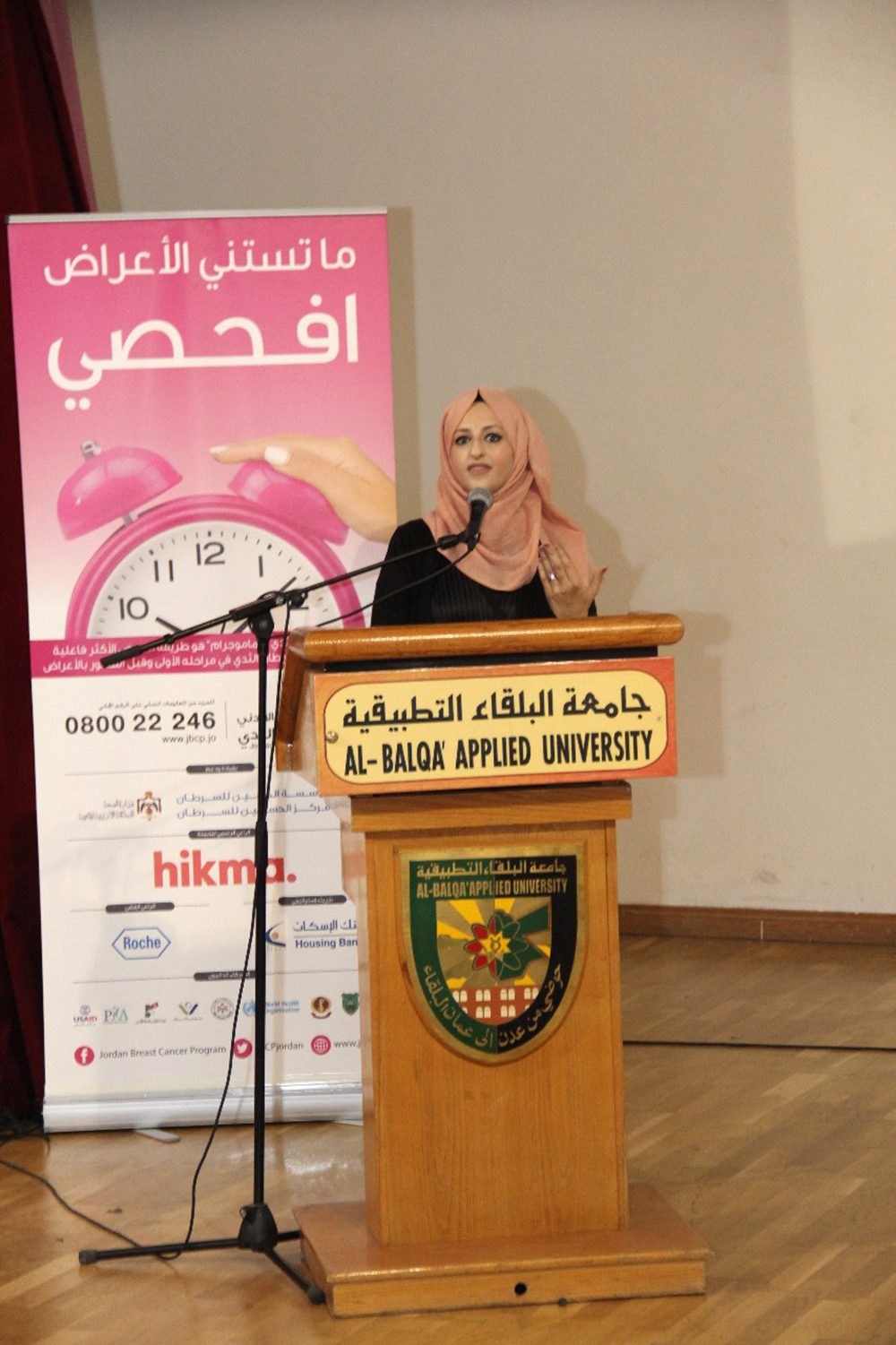 وتضمنت فعاليات اليوم الطبي محاضرة توعوية للدكتورة لطيفة مرعي من كلية الطب في جامعة البلقاء التطبيقية حول الكشف المبكر عن سرطان الثدي ، حيث قدمت شرحا للتعريف بسرطان الثدي وأنواعه واسباب وإعراض الاصابة والتعرف على طريقة الفحص الذاتي وطرق الوقاية منه وأهمية الكشف المبكر عنه مما يزيد نسبة ألشفاء والتأكيد على أهمية إجراء الفحوصات اللازمة،مؤكدة على اهمية اجراء الفحوصات الدورية للكشف المبكر عن سرطان الثدي حيث ان الكشف المبكر عن الاصابة يحقق نسبة شفاء تصل 98%.