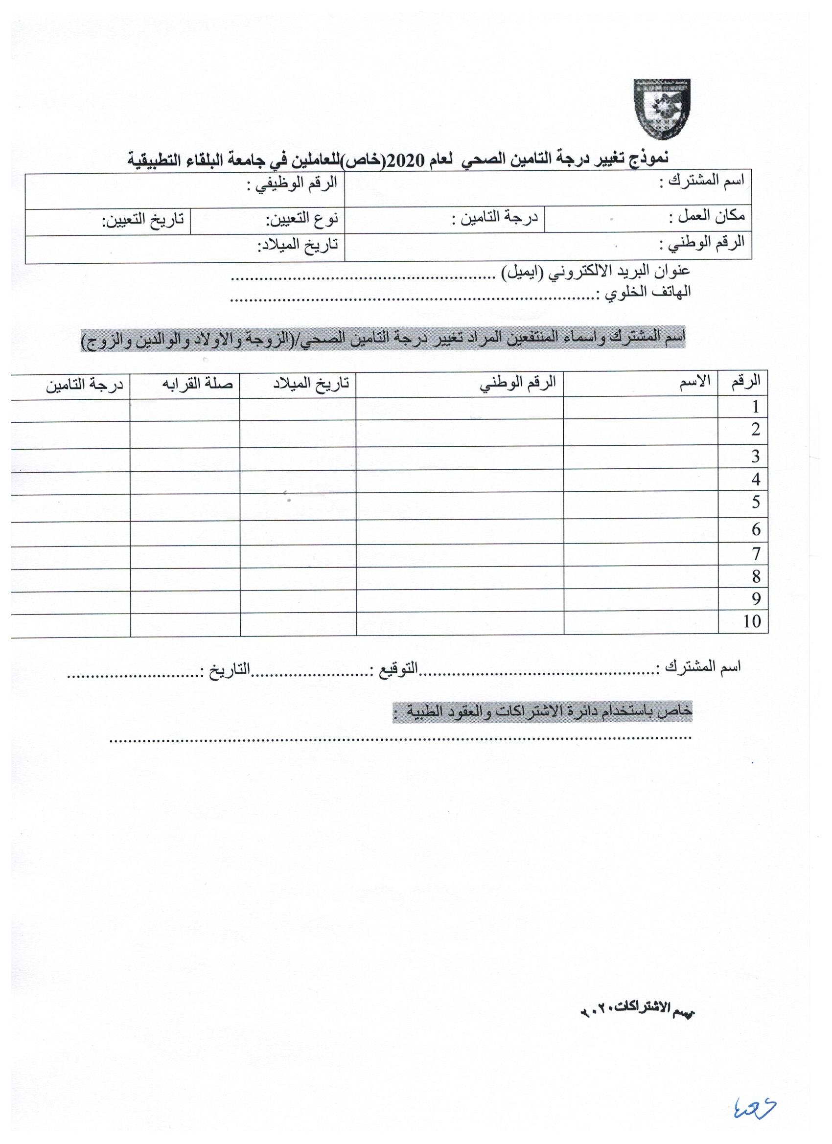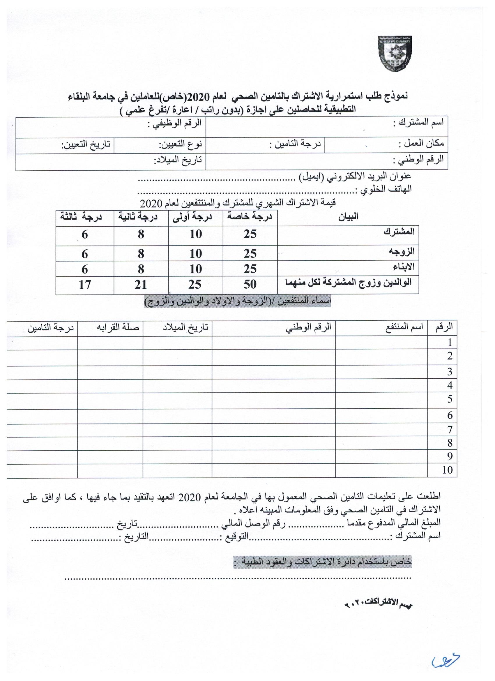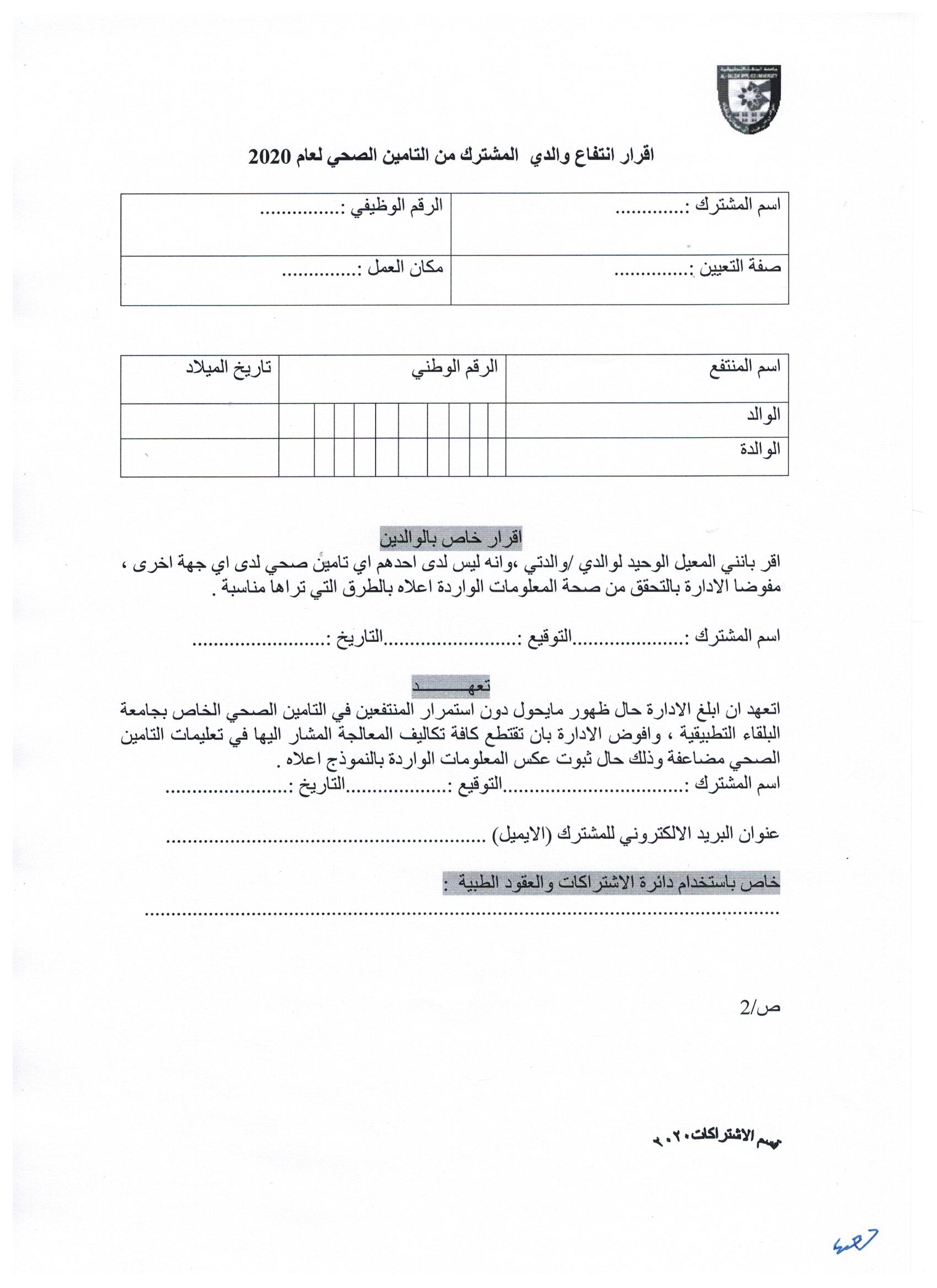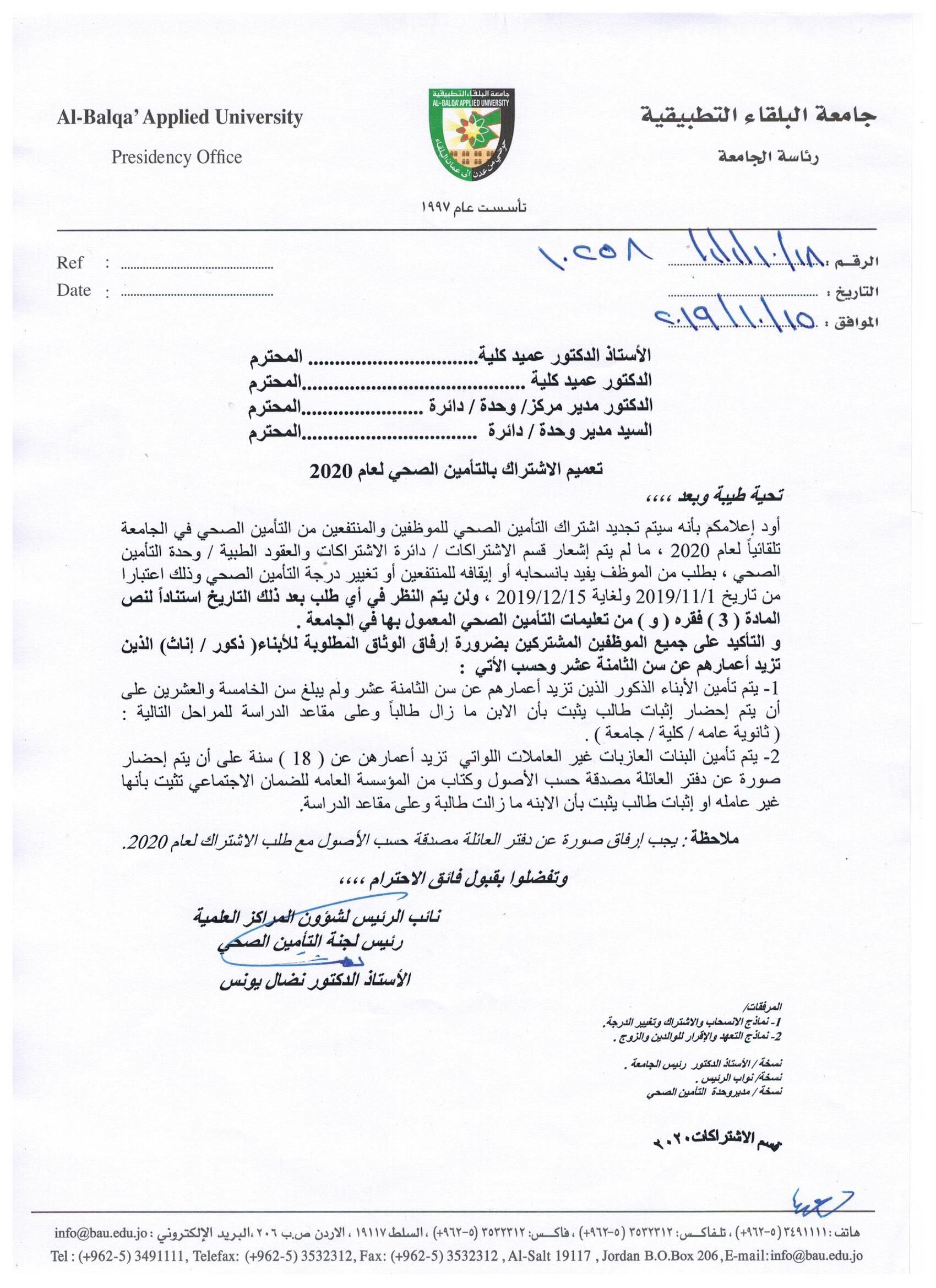 تعميم الاشتراك بالتامين الصحي لعام 2020( حسب تعليمات التامين الصحي المعمول بها في الجامعة مادة (3) ) من تاريخ 1/11/2019 ولغاية تاريخ 15/12/2019 وحسب المرفقات