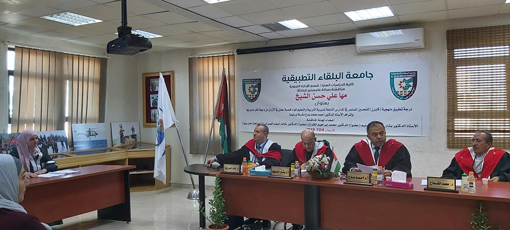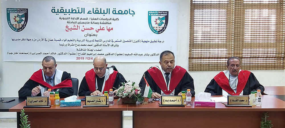 تم في صباح يوم الاربعاء الموافق 4/12/2019، مناقشة رسالة ماجستير للطالبة مها علي الشيخ تخصص الإدارة التربوية، قسم التخصص: العلوم التربوية بعنوان (درجة تطبيق منهجية (كايزين) للتحسين المستمر في المدارس التابعة لمديرية التربية والتعليم للواء قصبة عمان الأردن من وجهة نظر مديريها)