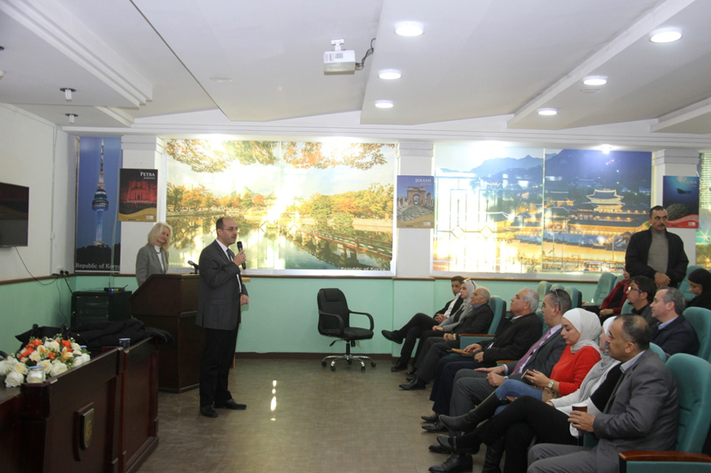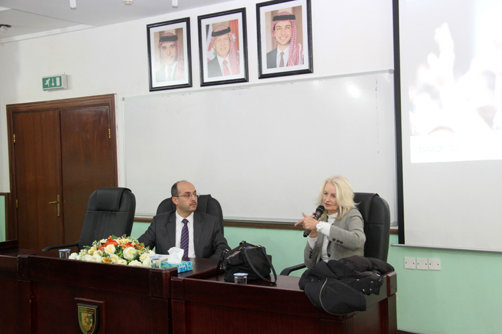 وقدم الاستاذ الدكتور ابو رمان الشكر الى السيدة غابريلا فريكس على المعلومات القيمة التي أثرت بها اعضاء هيئة التدريس والطلبة حول خدمات الداد في الاردن والعالم.