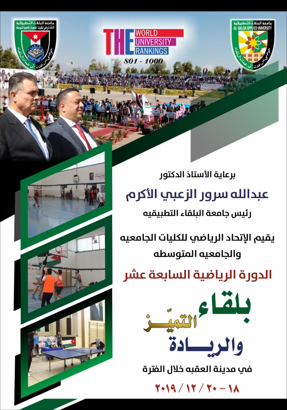 تحت رعاية رئيس جامعة البلقاء التطبيقية الاستاذ الدكتور عبدالله سرور الزعبي تنطلق صباح غد الاربعاء الموافق 18/12/2019 نهائيات الدورة الرياضية السابعة عشر بلقاء التميز والريادة والتي ينظمها الاتحاد الرياضي للكليات الجامعية والجامعية المتوسطة وذلك في مدينة العقبة خلال الفترة 2019/12/18-2019/12/20 بمشاركة 16 فريق من كليات حكومية وعسكرية وخاصة .