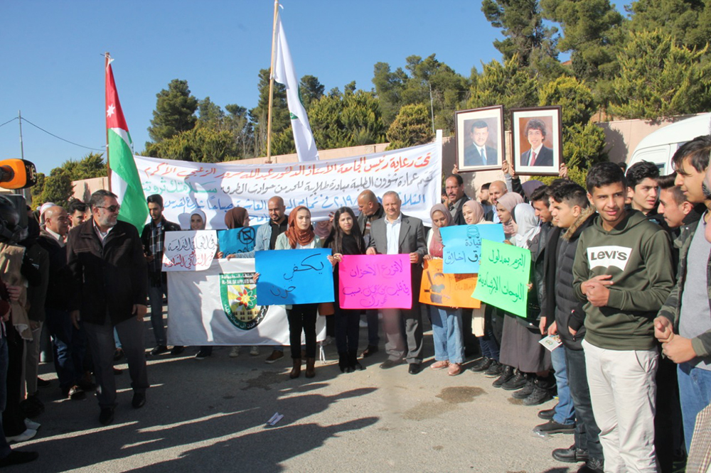 الوقفة التي نفذها طلبة الجامعة بحضور عميد شؤون الطلبة الدكتور فادي سماوي وممثلي عن المجتمع المحلي على شارع القدس ( الستين) في مدينة السلط تهدف الى تسليط الضوء على مخاطر حوادث السير والخسائر الجسيمة التي يتكبدها الوطن والأثر النفسي للمتضررين من الحوادث والأثر السلبي على موارد الدولة البشرية والمادية .