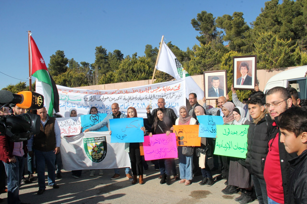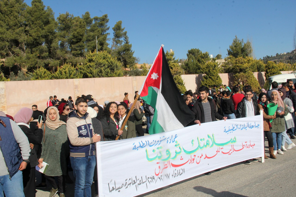 نظمت عمادة شؤون الطلبة في جامعة البلقاء التطبيقية وبالتعاون مع مديرية الامن العام وعدد من المؤسسات والمجتمع المحلي وقفة تضامنية بعنوان " سلامتك ثروتنا " للحد من حوادث السير.