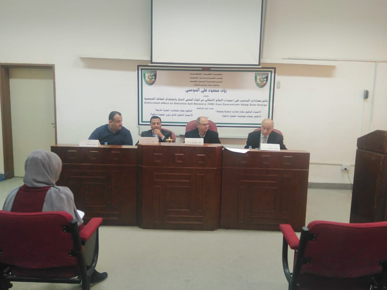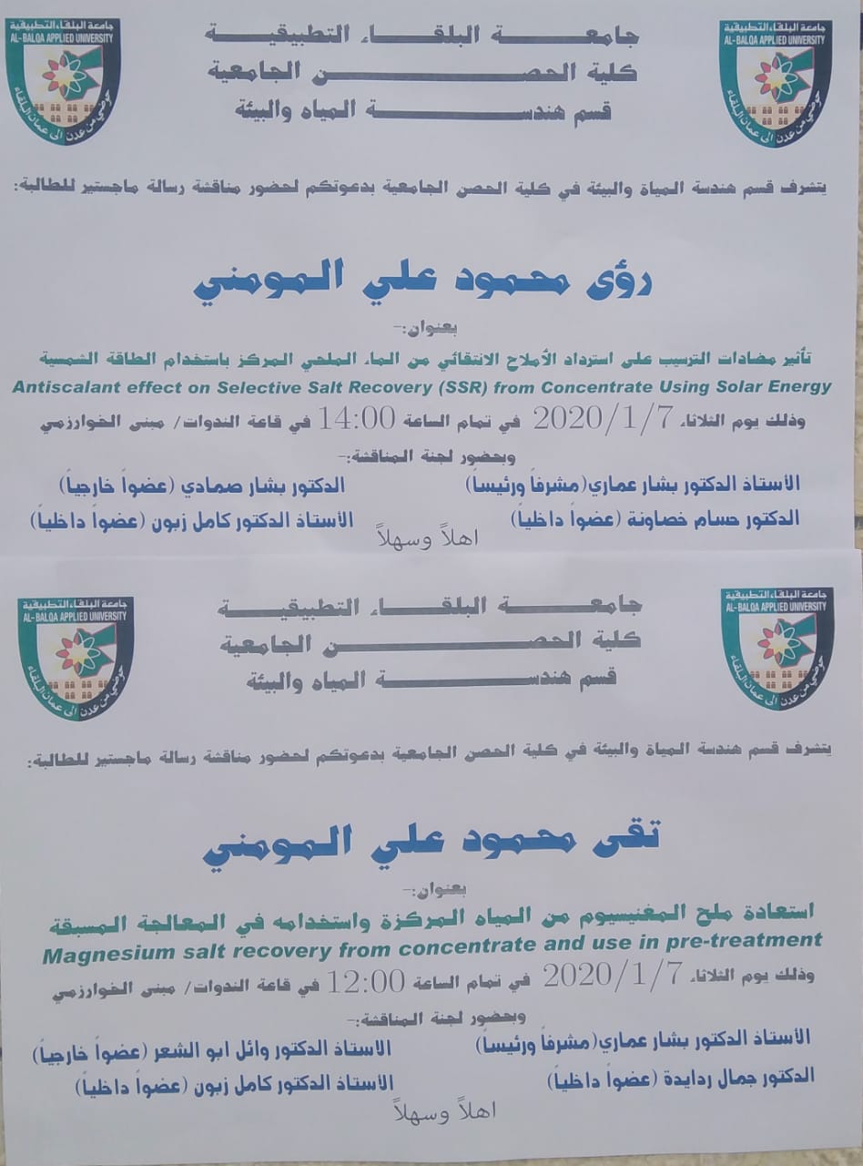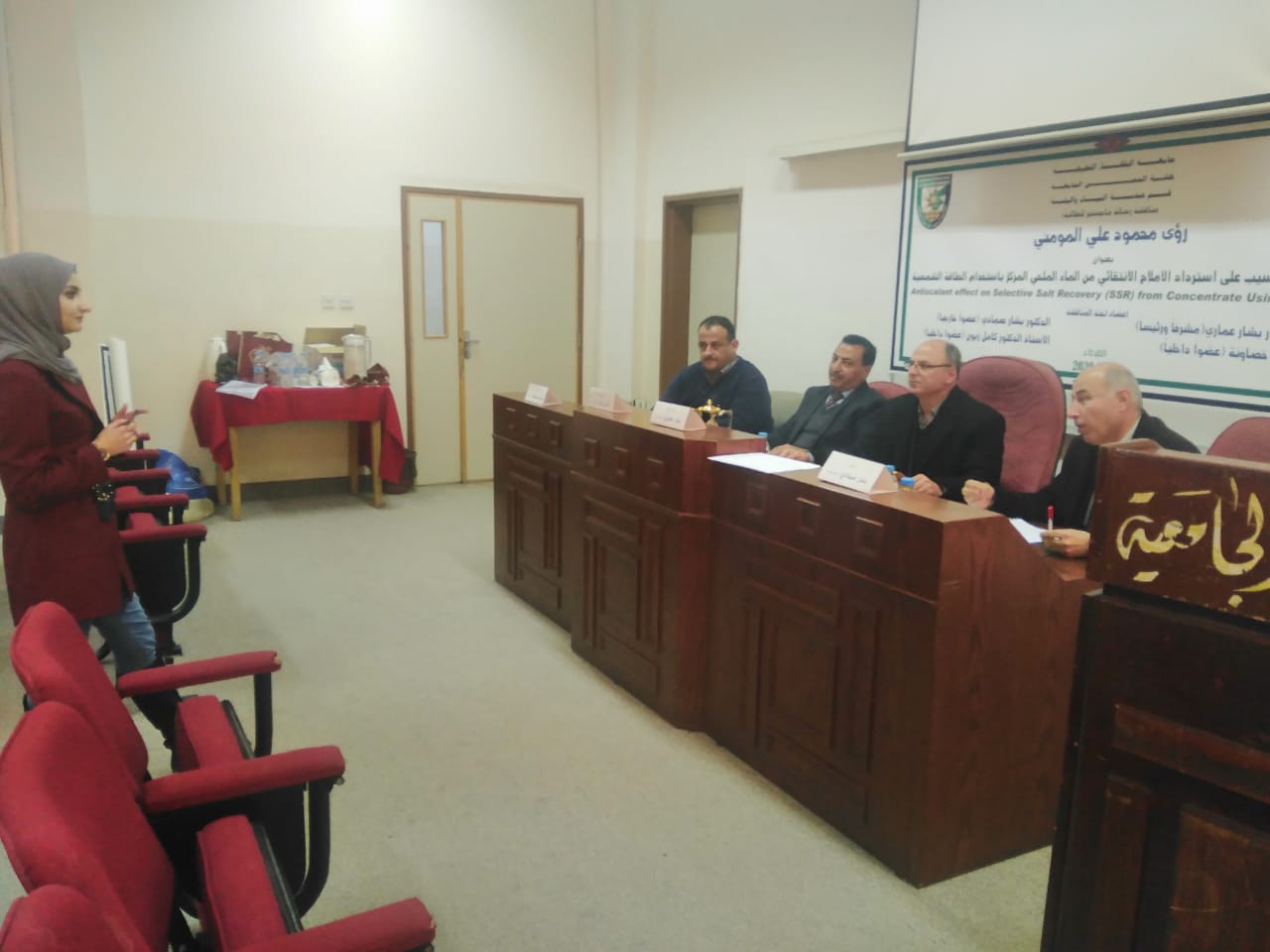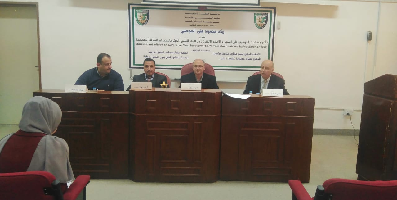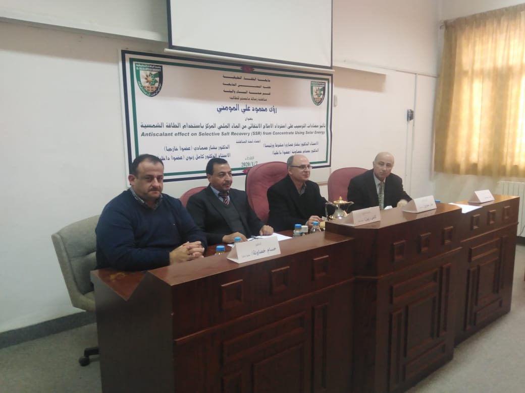 كما نوقشت رسالة ماجستير أخرى من الطالبة تقى محمود علي المومني بعنوان استعادة ملح المغنيسيوم من المياه المركزة واستخدامه في المعالجة المسبقة